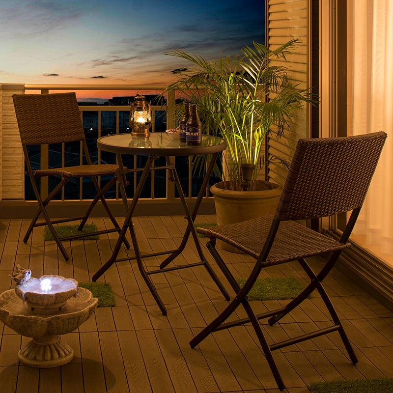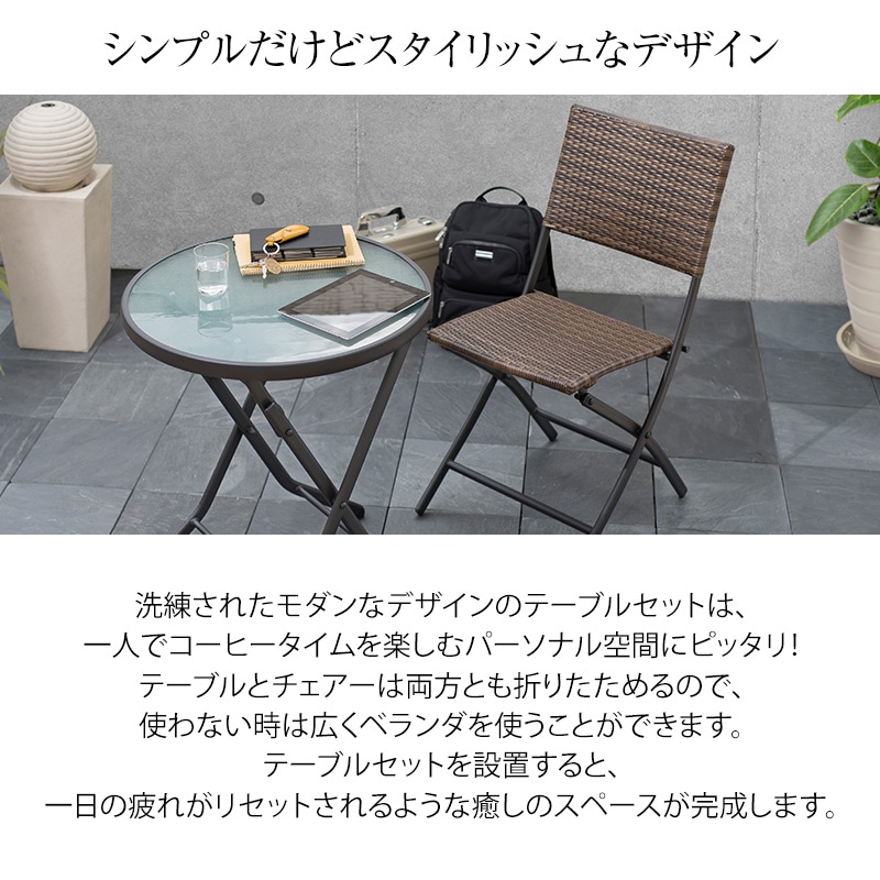 洗練されたモダンなデザインのテーブルセットは、コーヒータイムを楽しむパーソナル空間にピッタリ!テーブルとチェアーは折りたためるので、 使わない時はコンパクトに収納して空間を広く使うことができます。