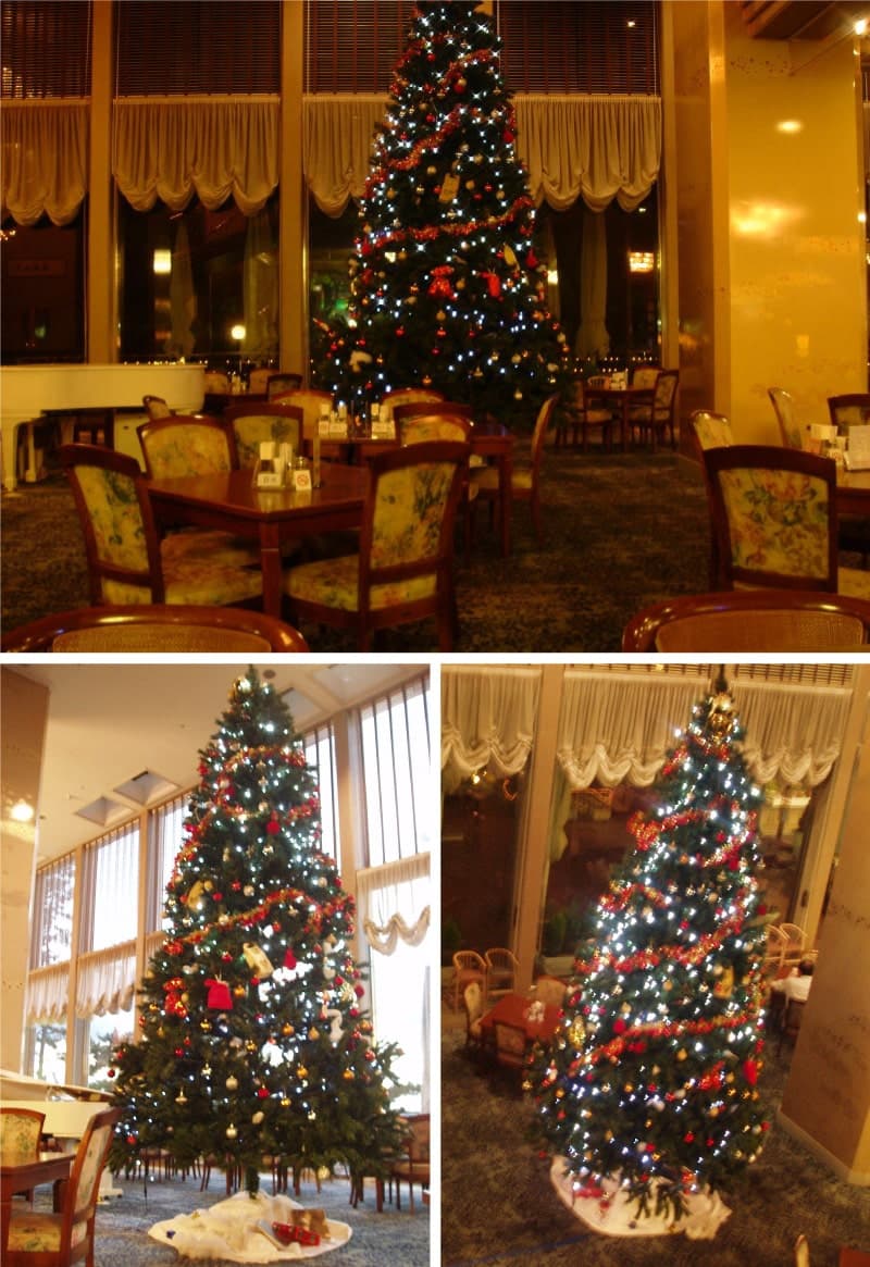 ホテルのロマンチックな雰囲気に合わせた美しいツリー。オーナメントやガーランド、イルミで飾り付け、夜もライトアップさせることで昼と夜の違う表情を楽しめるようにしました。