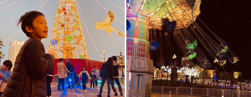 息子のもう一つの楽しみは、休日限定のアトラクションフリーパスです。この日はあいにくお目当てのアトラクションが運休していて、空中ブランコだけでも7回は乗りました。その後全てのアトラクションも制覇しました。光り輝くイルミネーションを空中から見る体験は、とても立体的で美しく新鮮でした。家族全員が興奮しました。ただし、私は空中ブランコで気分が悪くなりつつも、息子は大喜び。その笑顔を見ると、苦しさも吹き飛びました。