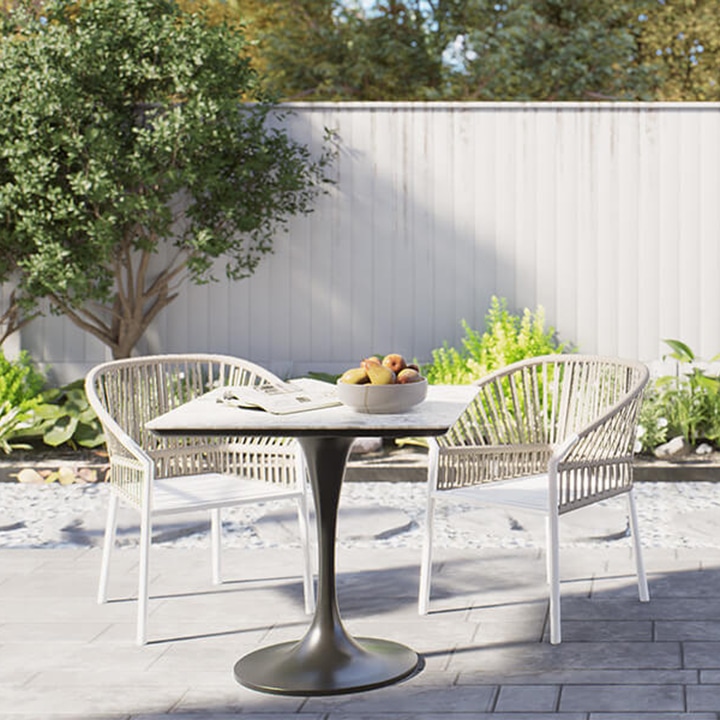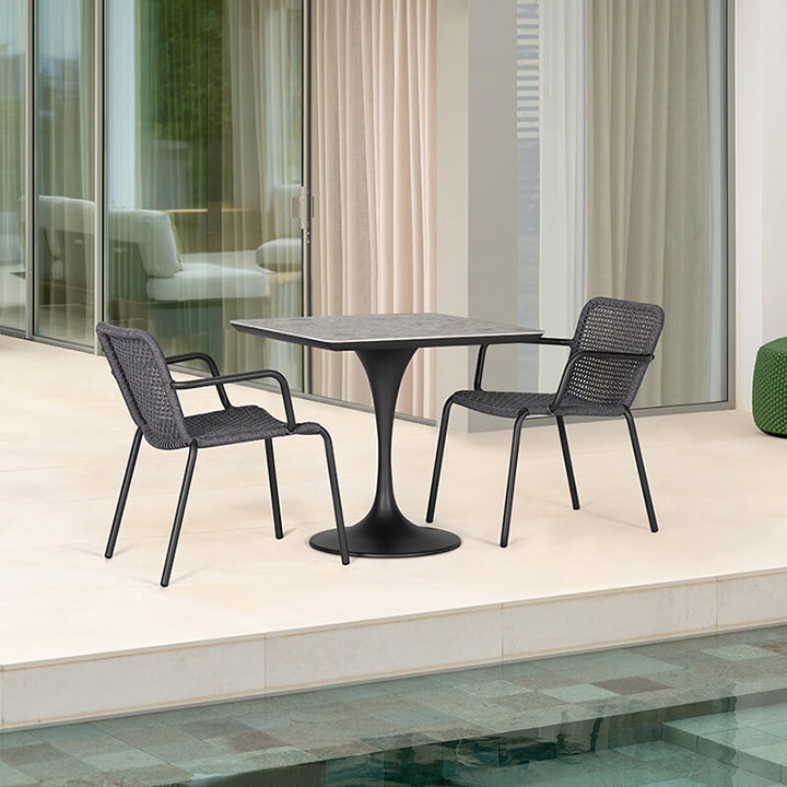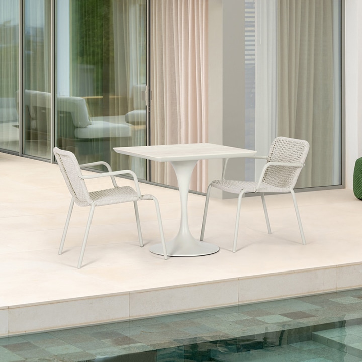 エレガントなフォルムが美しい2人掛けテーブル。テラゾー柄のセラミック天板がスタイリッシュな空間を演出します。