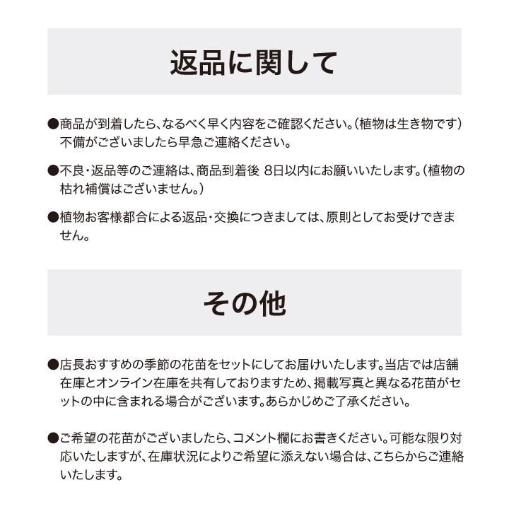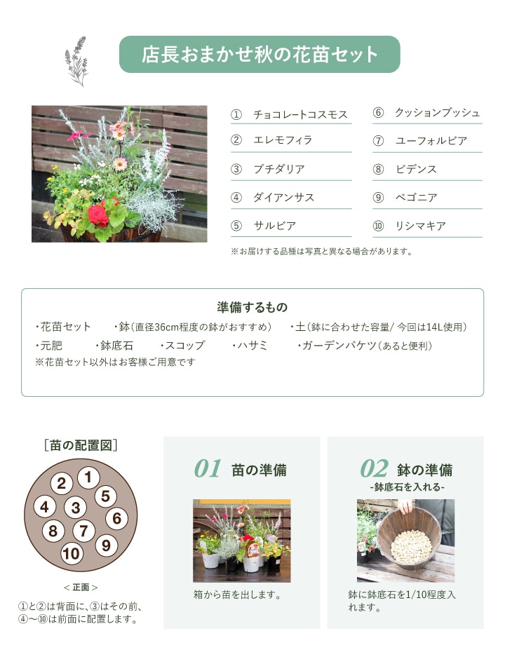 その季節にぴったりの旬な花苗をガーデナーズの店長がセレクト!彩り豊かな花苗を寄せ集めてお届けする、おまかせセットです。