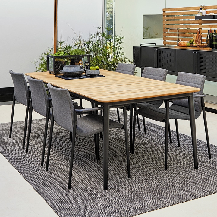 天板には天然木を使用、脚はアルミ製で、異素材を組み合わせたデザインが魅力のダイニングテーブル。