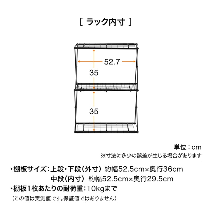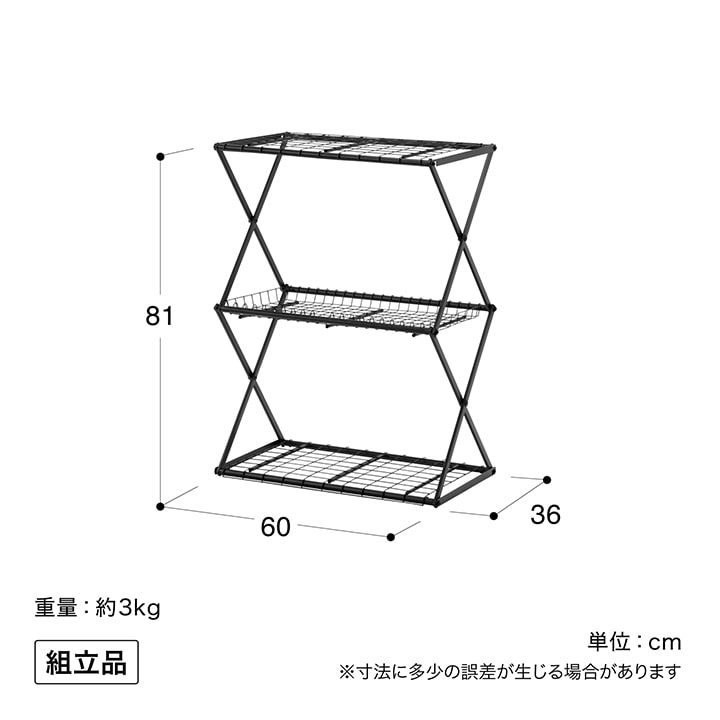 | 備考 : | [本体の折りたたみサイズ]約幅60cm×奥行53.5cm×高さ6cm [棚板(上段・下段の外寸)]約幅52.5cm×奥行36cm [棚板(中段の内寸)]約幅52.5cm×奥行29.5cm [棚板1枚あたりの耐荷重]10kgまで(上・中・下段)※この値は実測値です。保証値ではありません。 [組立必要人数]1人[本体組立時間]20分未満 |