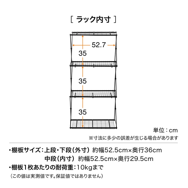 | 備考 : | [本体の折りたたみサイズ]約幅60cm×奥行53.5cm×高さ8cm [棚板(上段・下段の外寸)]約幅52.5cm×奥行36cm [棚板(中段の内寸)]約幅52.5cm×奥行29.5cm [棚板1枚あたりの耐荷重]10kgまで(上・中・下段)※この値は実測値です。保証値ではありません。 [組立必要人数]1人[本体組立時間]20分未満 |