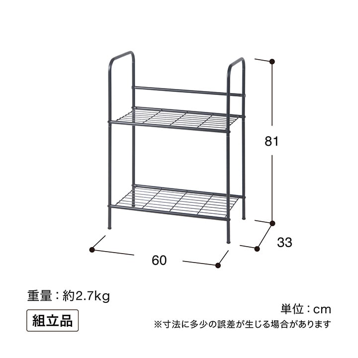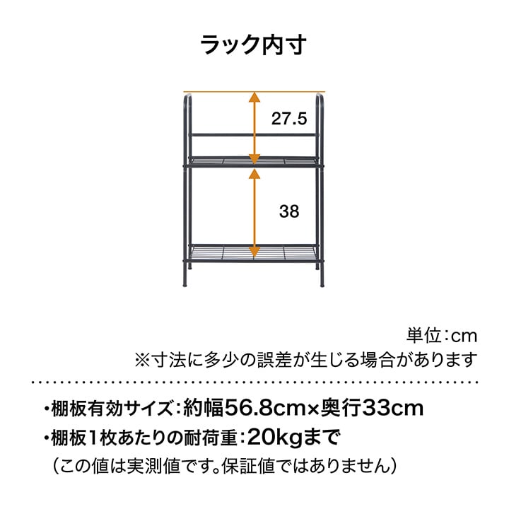 | 備考 : | [棚板]約幅56.8cm×奥行33cm [棚板1枚あたりの耐荷重]20kgまで※この値は実測値です。保証値ではありません。 [組立必要人数]1人[本体組立時間]20分未満 |