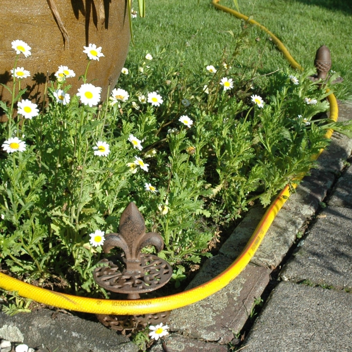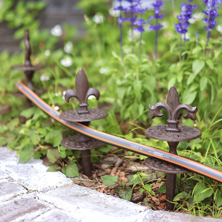 庭にホースを伸ばして水まきをする際、ホースが大切な植物をなぎ倒してしまうのを防ぎます。紋章を模したデザインが庭に気品ももたらします。