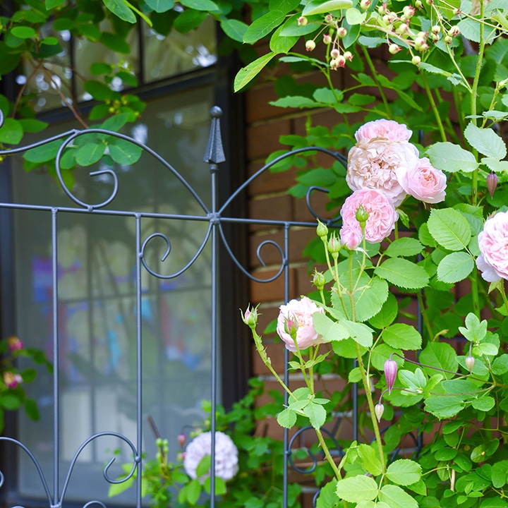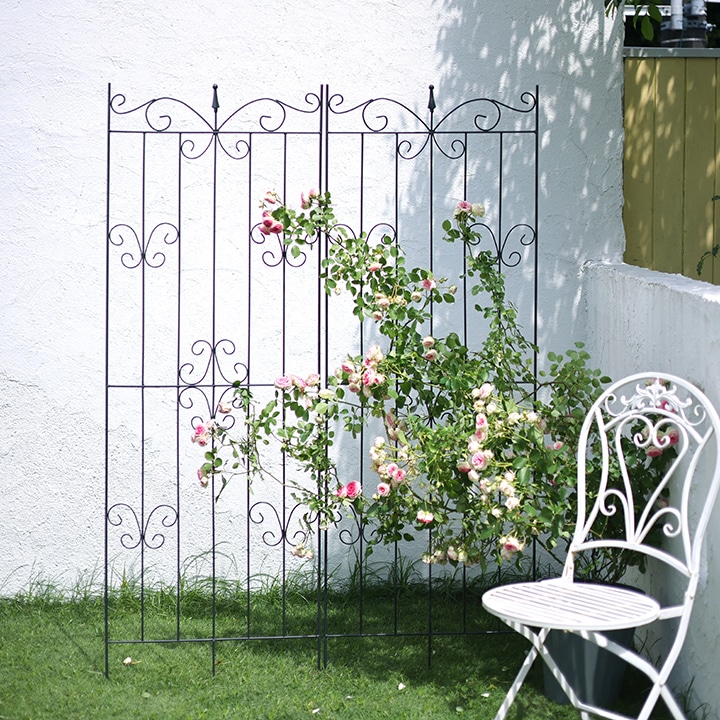 「線が細く曲線が優美なデザインは、庭の植物とよく馴染んでくれます。庭の主役はあくまでも植物なので、トレリス、フェンスは目立ちすぎないのが大事。その点、ガーデンシリーズのトレリス、フェンスは、どの色も控えめで上品な存在感が魅力です。ところどころに施されたパピヨンのフォルムは、装飾としてだけでなく、植物のつるを絡めたり、茎を沿わせたりと機能的にも優秀。軽量で持ち運びしやすいので、定位置で固定しなくても、季節の花に合わせて移動しながら使うのがおすすめ。生育につれ株が大きくなって、植物が庭の入り口や小径をふさいでしまうことがありますが、そんなときにフェンスやトレリスを使うと乱れた株が簡単に整えられて重宝します」