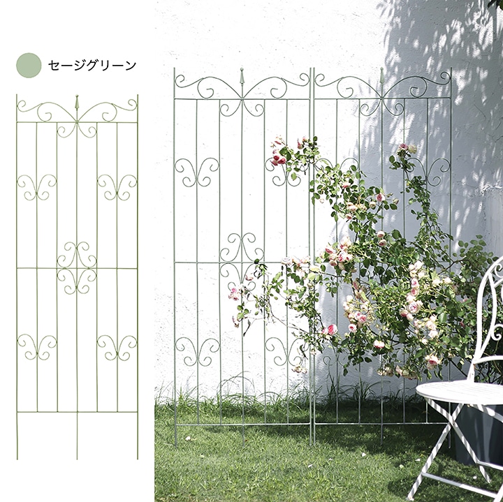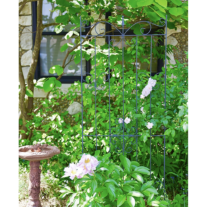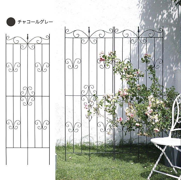 優雅な曲線と蝶のモチーフが施された高さ180cmのトレリス。幅60cmなので広がりのあるつる植物もしっかり支えられ、背景や仕切りとしての存在感も発揮します。エレガントな曲線デザインは庭全体を上品にまとめ、カラーによっては外国の庭のような雰囲気を醸し出します 花がない冬の間も、エレガントなパピヨン(蝶)模様のトレリスが庭を美しく演出してくれます。