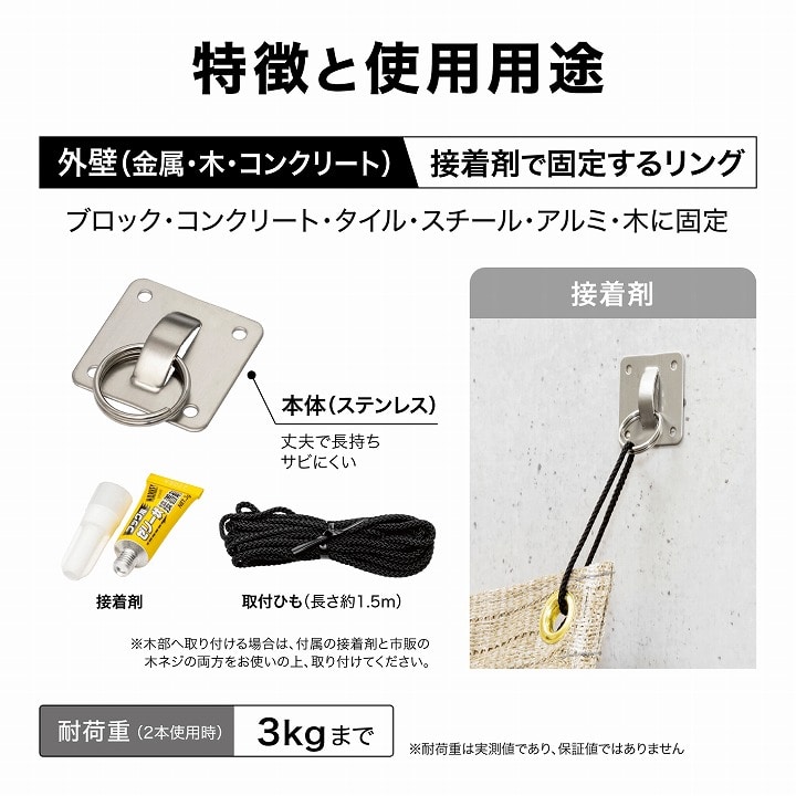 ●2個組●金属・コンクリート・タイル・木用●耐荷重:3kgまで(2個取付時)●付属品:ひも(約1.5m)・ゼリー状接着剤