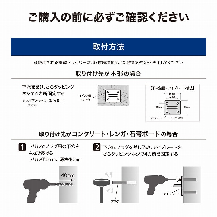 屋外コンクリートやブロックにしっかり打ち付け固定出来るフック。 ステンレス製なので、サビにくい。 ※壁材によっては接着ができない場合がございますので、事前に施工された業者・ハウスメーカー等にご確認をお願いいたします。
