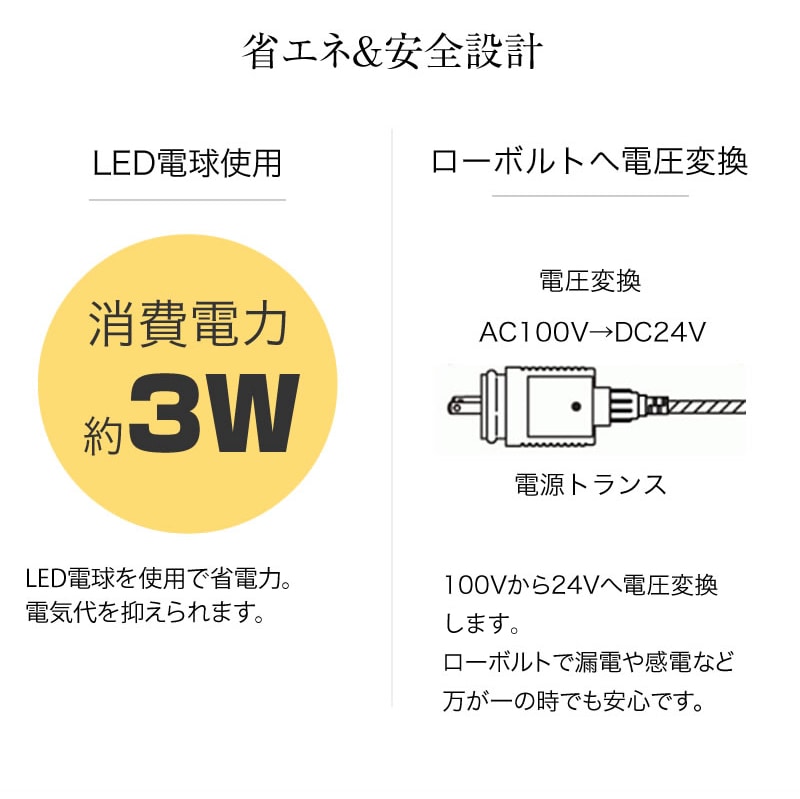 | 備考 : | ●使用環境:屋外●延長コード:約5m●LED:36球(シャンパンゴールド)●最大ワット数:6W※専用コントローラー●消費電力:約2.6W※LED部のみ●8ファンクション●当社2in1シリーズの商品に限り付属の専用コントローラー(LIT-06)で4.2Wまで連結可能。別売の専用コントローラー(LIT-35)で24.5Wまで専用コントローラー(LIT-80)で64Wまで連結可能。※本商品のみでの連結不可。延長・分岐には別売の2in1ブロー専用コードをご使用ください。 |