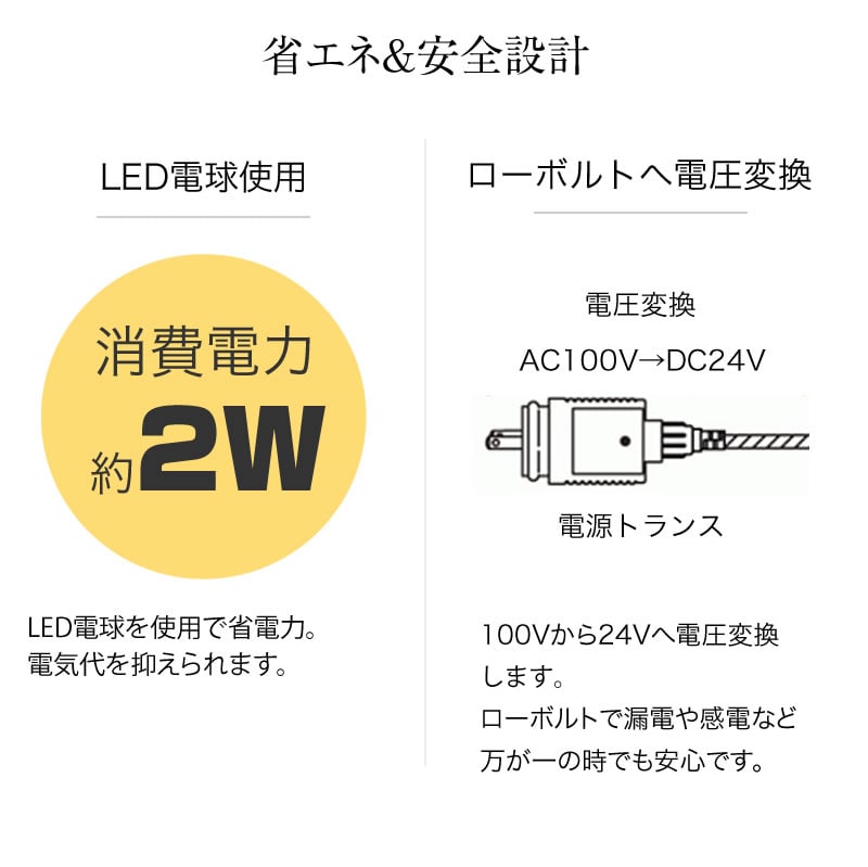 | 備考 | 使用環境:屋外、延長コード:約5m、LED:36球(シャンパンゴールド)、最大ワット数:6W、消費電力:約3W※本体のみ、8ファンクション 当社2in1シリーズの商品に限り付属の専用コントローラー(LIT-06)で4.2Wまで連結が可能です。 別売の専用コントローラー(LIT-35)で24.5Wまで連結が可能です。 |