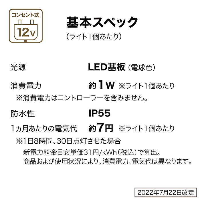 | 備考 : | [使用環境]屋外[コード全長]約10m[LED色]電球色(2700K) [LED数]1球/1台あたり[電圧]12V[消費電力]約1W/1台あたり ひかりノベーションシリーズの専用コントローラーへの接続可能 [防水性]IP55 [組立必要人数]1人[本体組立時間]20分未満 1年保証 |