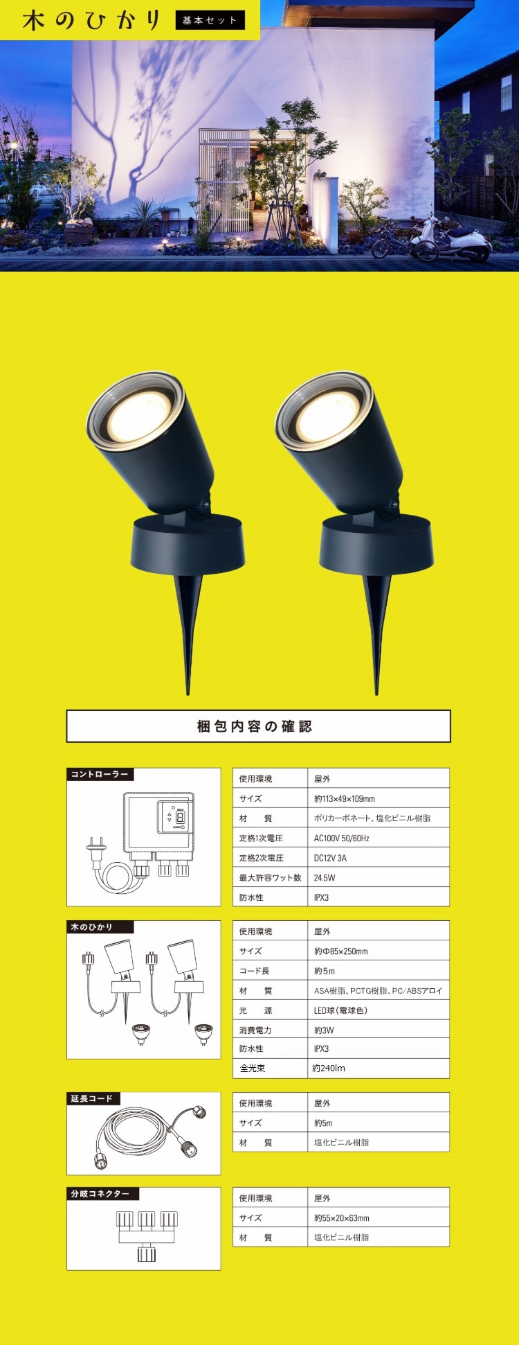 | 材質 | ライト本体:ASA樹脂、PCTG樹脂、PC/ABSアロイ、コントローラー:ポリカーボネート、塩化ビニル樹脂 電球:アルミニウム、分岐プラグ:塩化ビニル樹脂、延長コード:塩化ビニル樹脂 |