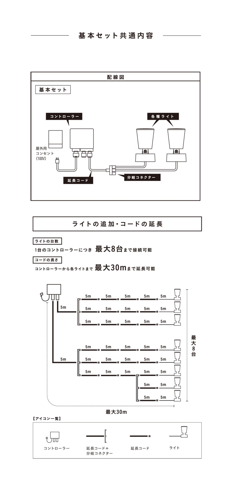| 備考 : | 全光束:約240lm 本体カラー:ブラック [使用環境]屋外[コード全長]約5m[LED色]電球色(2700K)[LED数1球/1台あたり]電圧:12V、消費電力:約3W ひかりノベーションシリーズの専用コントローラーへの接続可能 [防水性]IPX3 ひかりノベーション専用コントローラー付属 |