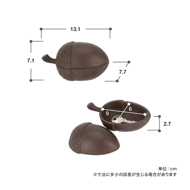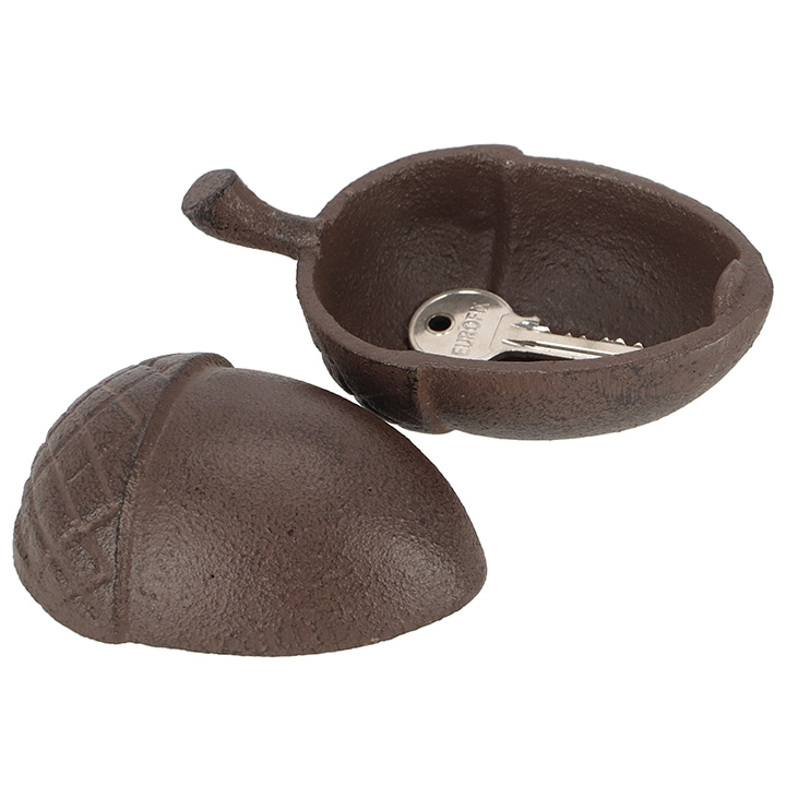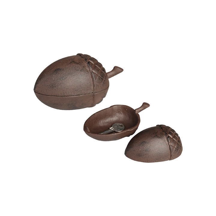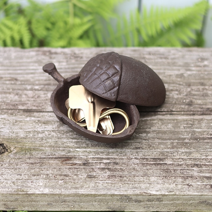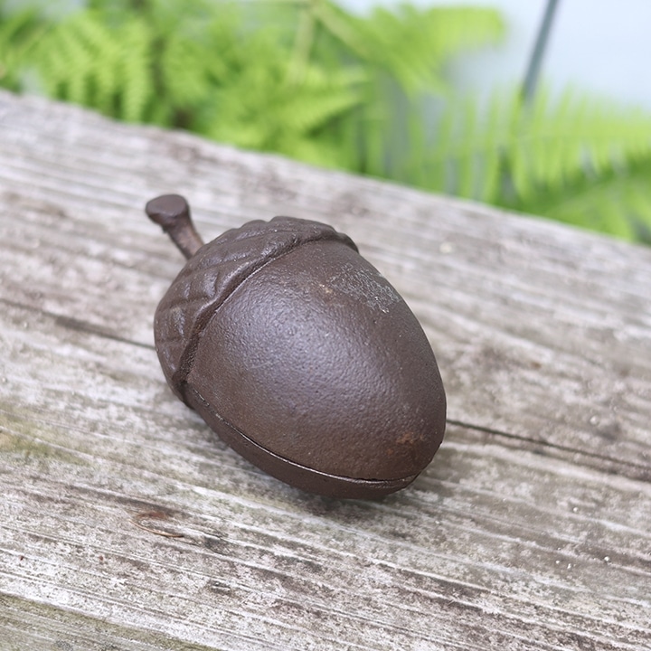 重厚なアイアン製の、愛らしいドングリのオブジェ。一見ただの置物のようですが、じつは蓋をあけて合鍵の隠し場所や小物入れとして利用できます。手作りで制作された風合いは、ガーデンにはもちろん、インテリアアイテムとしても素敵です。