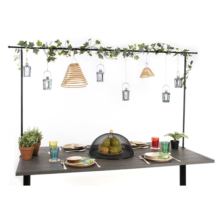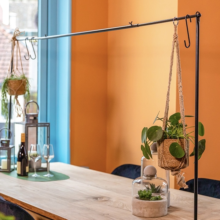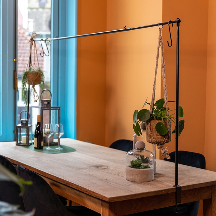 テーブルに挟んで取り付けるだけで、吊るす・飾る・魅せる空間をつくれるアイテム。植物のハンギングや季節のデコレーション、照明やモビールの演出まで、「置く」から「吊るす」へと、空間の自由度を一気に広げてくれます。