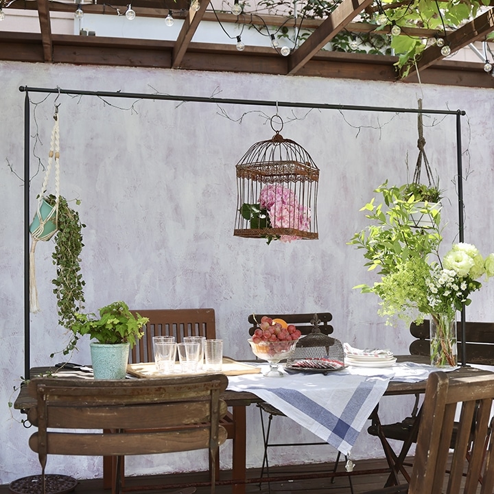 設置は簡単。2カ所をしっかり固定するだけで、ぐらつきなく安定します。ガーデンテーブルや作業台、棚やキッチンカウンターにも応用可能。天井に穴を開けられない賃貸空間でも、ハンギンググリーンを楽しめると好評です。