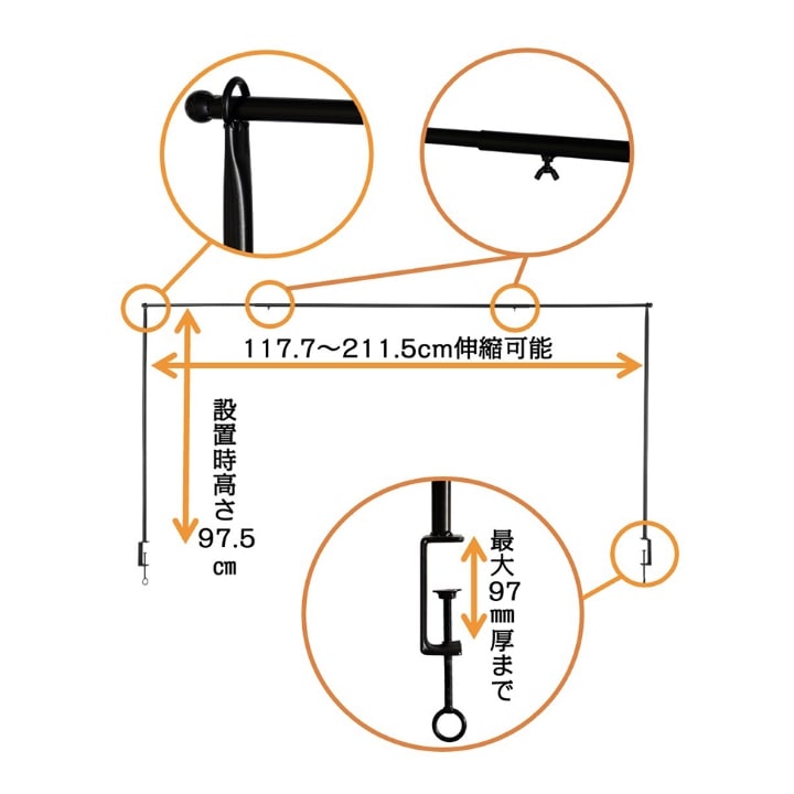 横に渡す棒は伸縮可能です。設置する場所の幅は、最小117.7cm、最大211.5cmの間でサイズを調整でき、使いたい空間に合わせてフレキシブルに対応します。 天板の厚みは、97mmまで対応。2カ所をしっかり固定して設置しましょう。