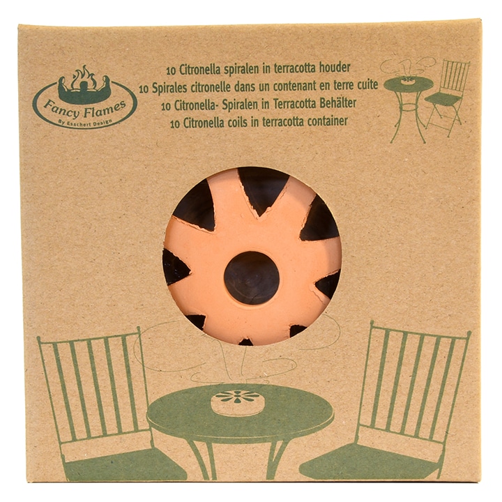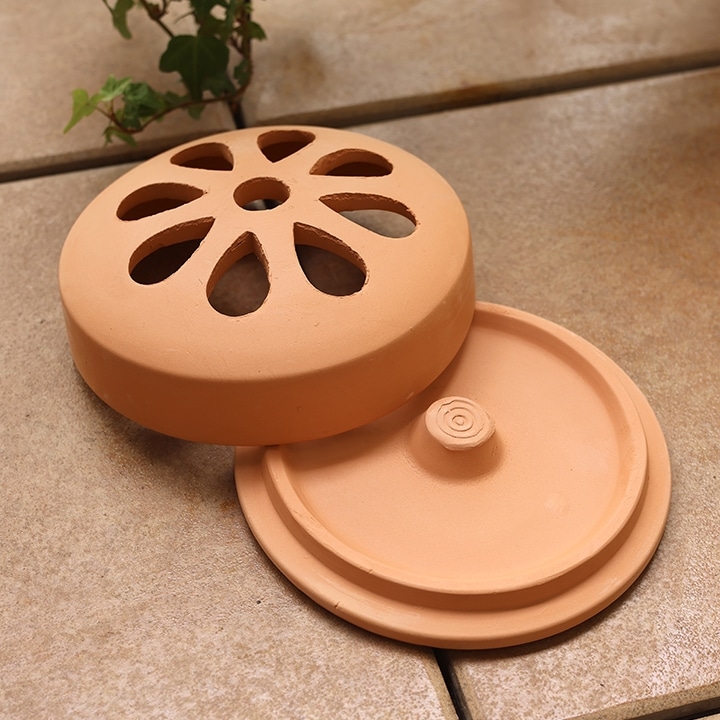 風がふいても蓋に厚みがあるため火が消えにくく、煙はモチーフの穴からふんわりと立ち上ります。素材は熱くなりにくいテラコッタで、安全性と風合いのどちらも兼ね備えます。中央の突起に市販の蚊取り線香をそのままセット可能なサイズです(直径11cmまで)。