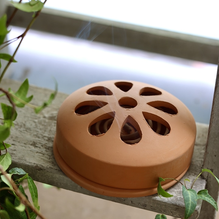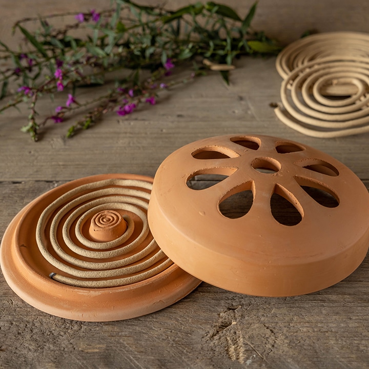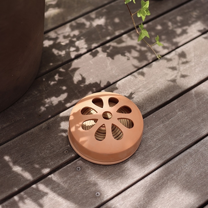 花のようなモチーフとナチュラルな質感が愛らしく、ガーデンでもインテリアでも使いたくなるテラコッタ製の蚊取り線香ホルダー。