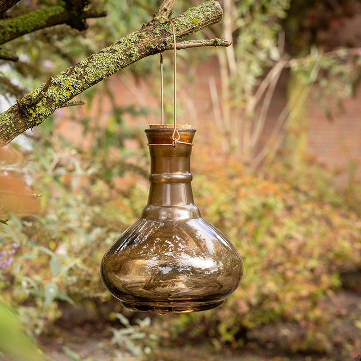 夏のガーデニングの大敵であるスズメバチ対策に。涼しげなガラス瓶は、蜂が入りやすく出られない構造になっており、レモネードや酢を入れて蜂をおびき寄せ、捕獲します。種類により平置きのほか、ワイヤーで吊り下げても使用可能。