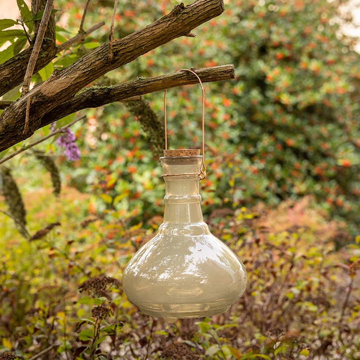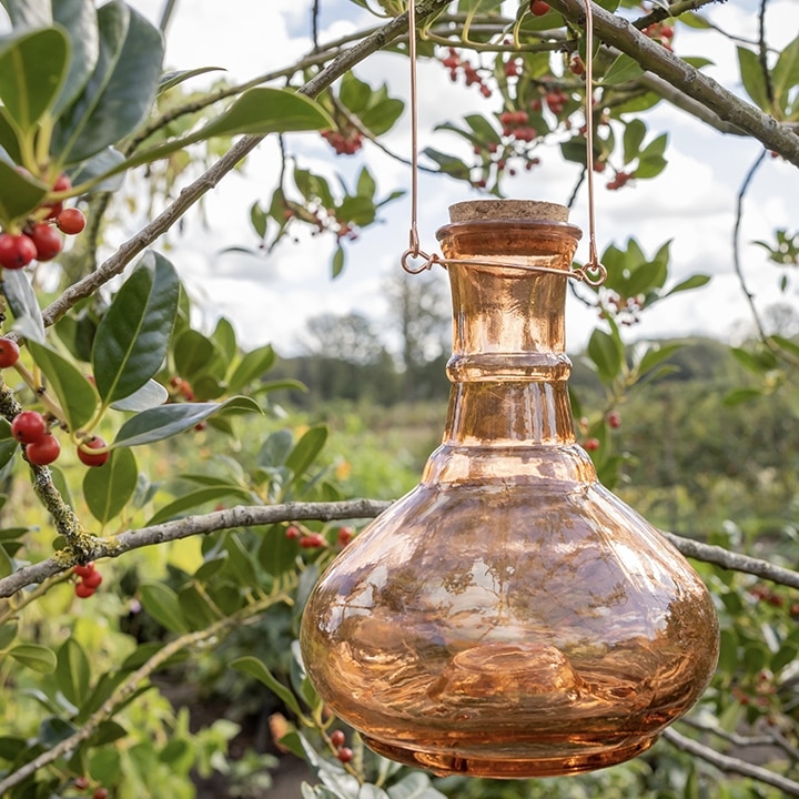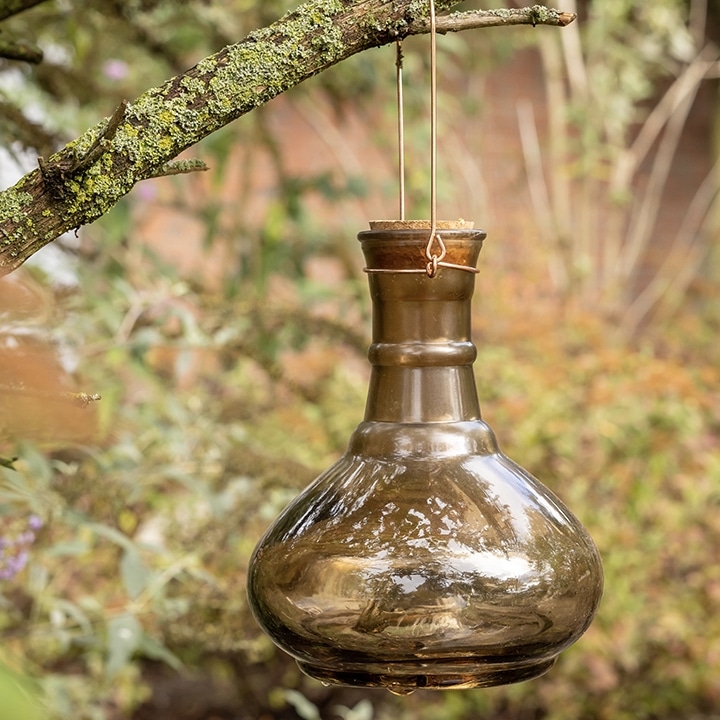 夏のガーデニングの大敵であるスズメバチ対策に。涼しげなガラス瓶は、蜂が入りやすく出られない構造になっており、レモネードや酢を入れて蜂をおびき寄せ、捕獲します。種類により平置きのほか、ワイヤーで吊り下げても使用可能。