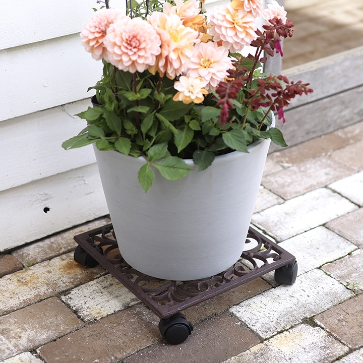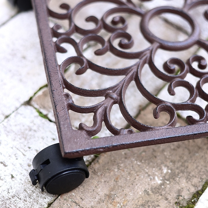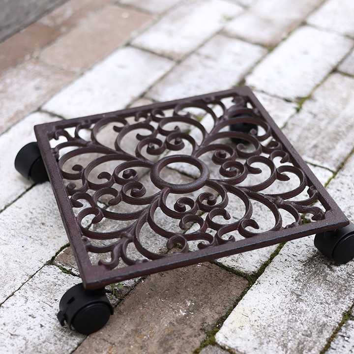 天板はアンティーク調の透かし模様の鋳鉄製レリーフ。このすのこ状の構造が、鉢底穴の通気性と排水性をしっかり確保。地面と鉢の間に空気の層をつくり、湿気がこもるのを防ぎます。 これは、鉢植え植物の根腐れ予防や、害虫(ナメクジやコバエなど)の発生を抑えるためにも非常に重要。 特に梅雨や夏場など、鉢底が直接濡れた地面に接していると病害虫の温床になりやすい季節には、こうした工夫が植物の健康を大きく左右します。