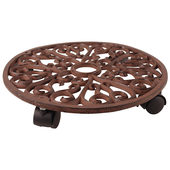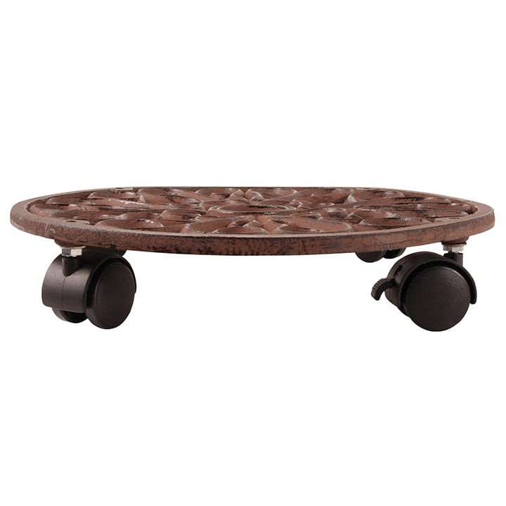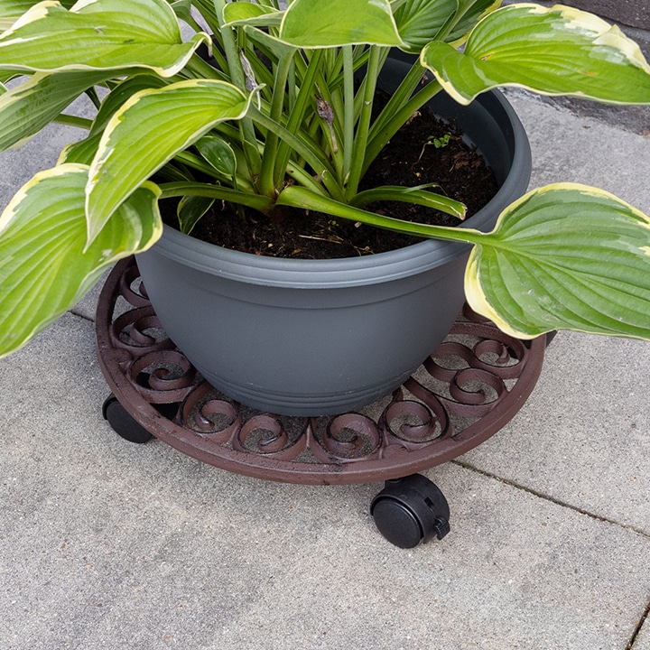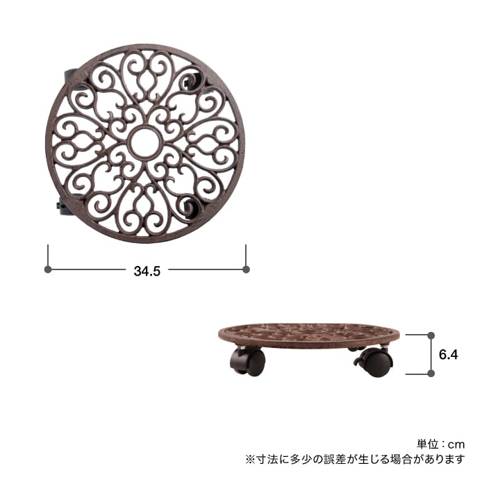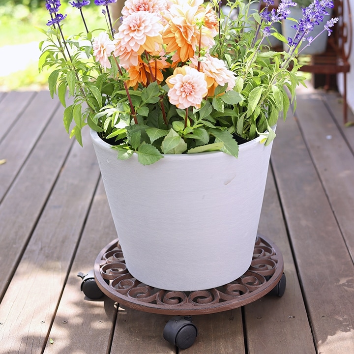 植木鉢11号程度(Lサイズ)、積載量30kgまでの屋外用丸型植物トレー。キャスター付きなので、重い鉢植えもレイアウト自由自在です。キャスターは凹凸のある地面も移動しやすい構造。ストッパー付きで安全性も考慮されています。