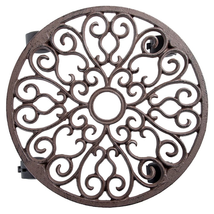 天板はアンティーク調の透かし模様が施された鋳鉄製レリーフ。この美しい意匠がすのこ状の構造になっており、鉢底の通気性・排水性をしっかり確保します。