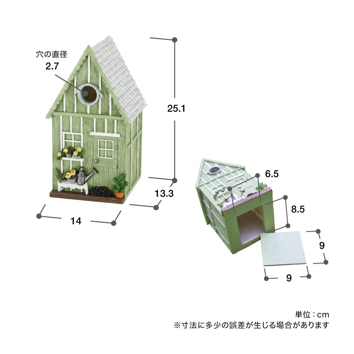 イギリスの古いガーデンシェッドをイメージした、爽やかなグリーンのバードハウス。鉢植えの花やジョウロ、そして小屋の前に寝そべる犬など、繊細なディテールも愛らしいミニチュアハウスです。