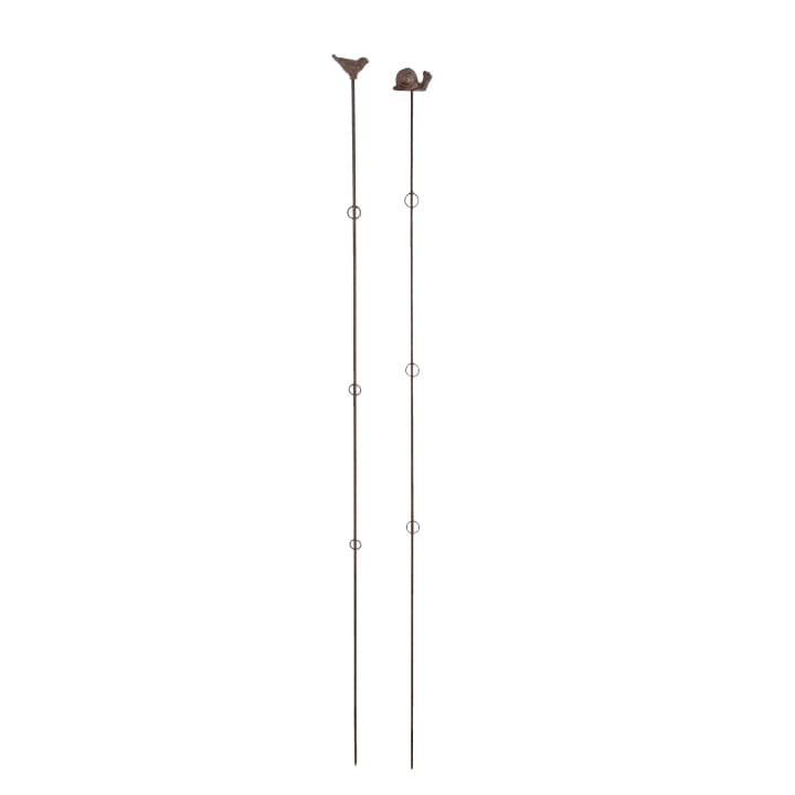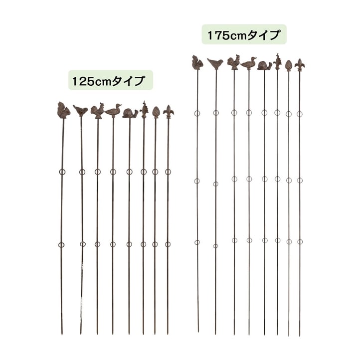 上部には8種類の装飾モチーフ(2本セットで4パターンから選択可)。アンティークカラーの鋳鉄製で、植物が絡みつく季節以外にも庭の景色を豊かに演出します。「ただの支柱」ではなく、植物と共に庭を引き立てるガーデンオブジェとしての魅力も兼ね備えています。