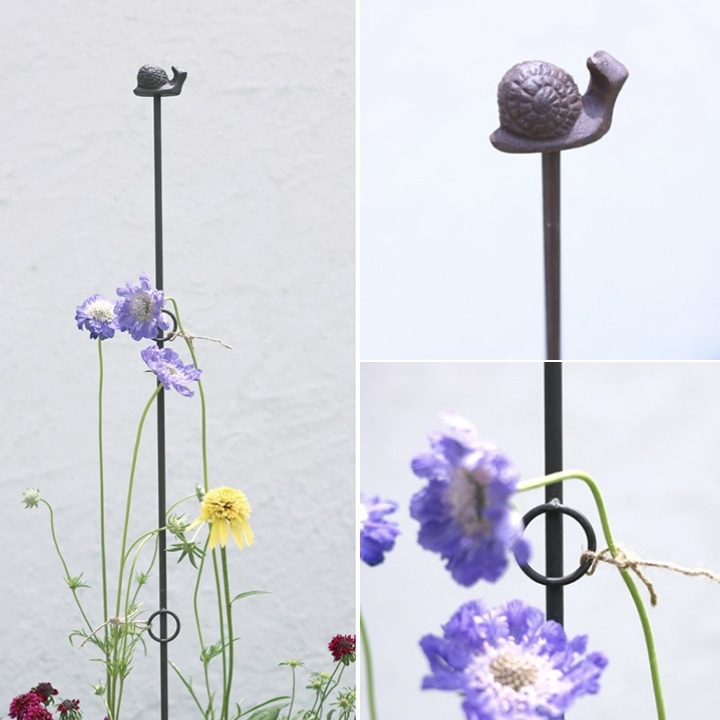 背の高く繊細な草花は、風や雨で倒れやすく、美しい姿を保つのが難しいもの。そんな時に役立つのが、この飾り付きプランツサポートです。 特に、デルフィニウムやスカビオサ、リナリア、ニゲラ、スイートピー、アグロステンマなど、茎が細く倒れやすい植物に最適。株元に挿し、リング部分に麻ひもなどで茎をやさしく結びつけて使います。風にそよぐ花たちを、スマートに支えてくれる頼もしい存在です。