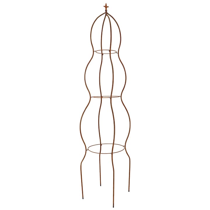 繊細なウェーブラインが目を引く、エレガントな佇まいのオベリスク。美しさだけでなく、この“波打つライン”が、誘引したつるがずり落ちるのを防ぐ構造になっているのが最大の特徴です。 地面に直接挿しても、直径50cm以上の鉢に挿し込んでも安定し、クレマチスやつるバラをはじめ、サンパラソル、カロライナジャスミン、宿根朝顔、ハーデンベルギア、テイカカズラなど多くのつる植物に最適です。