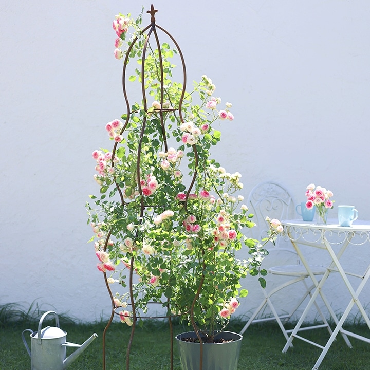 落ち着いたアンティークカラーのスチール素材は、植物との相性も抜群。花や葉が茂ったあとも主張しすぎず、全体の雰囲気を上品に引き締めてくれます。デコラティブすぎないからこそ、ナチュラルガーデンにも、シックなコンテナガーデンにも合わせやすいデザインです。