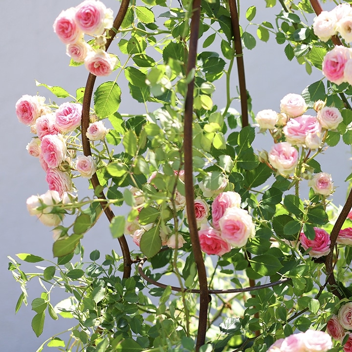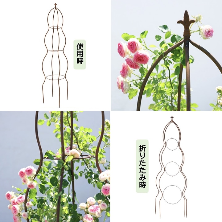 ゆるやかなウェーブラインはエレガントな雰囲気を醸し出すだけでなく、誘引ひもがずり下がるのを防ぐ機能も兼ね備えます。クレマチスやつるバラなど、つる植物の仕立てに活躍します。薄くたためて収納にも便利。