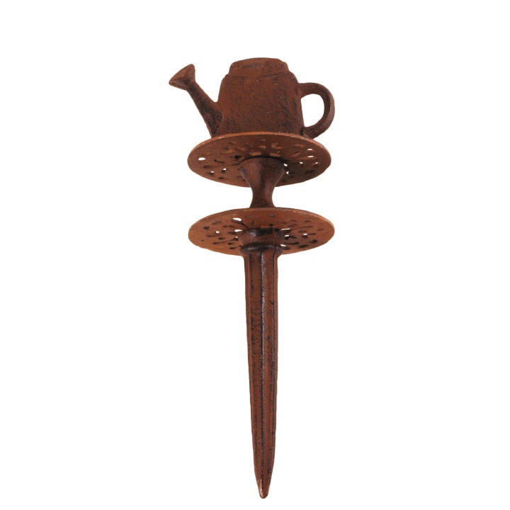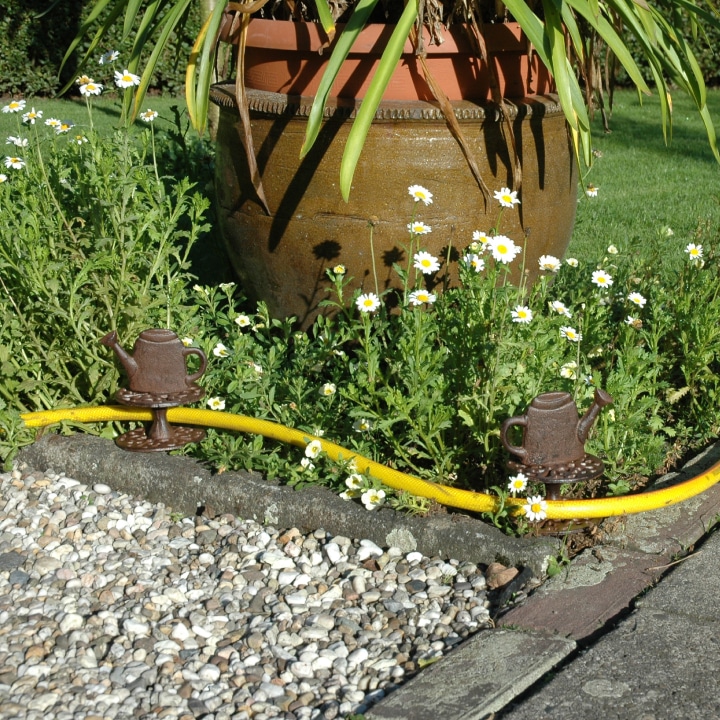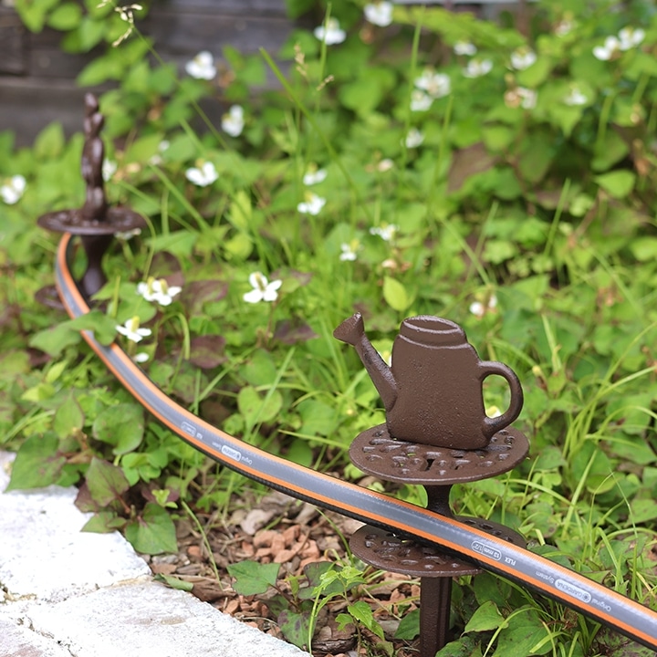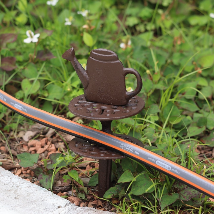庭にホースを伸ばして水まきをする際、ホースが大切な植物をなぎ倒してしまうのを防ぎます。ジョウロのモチーフが庭の風景によく馴染みます。