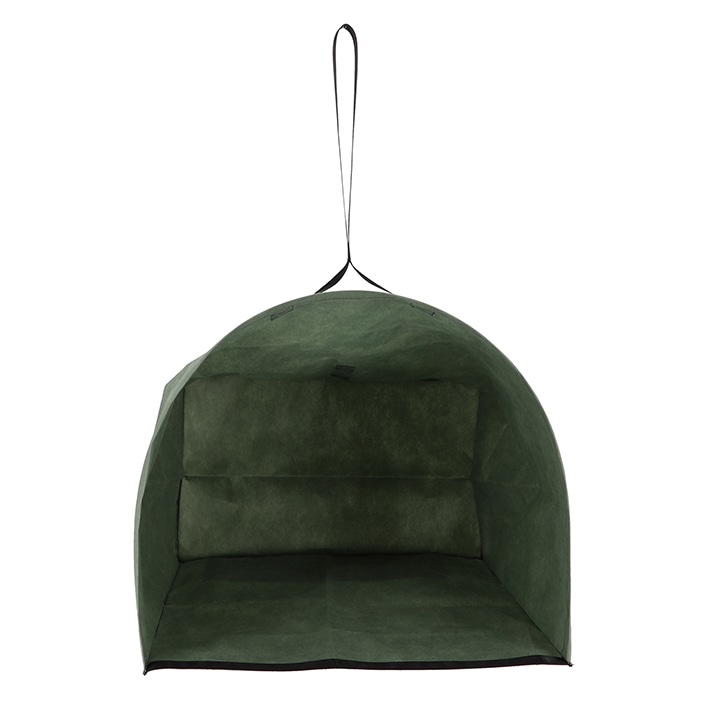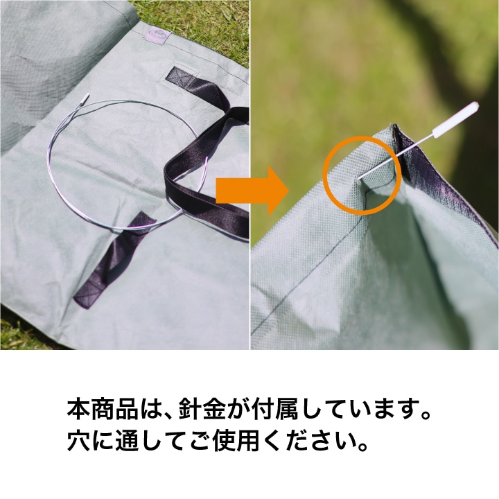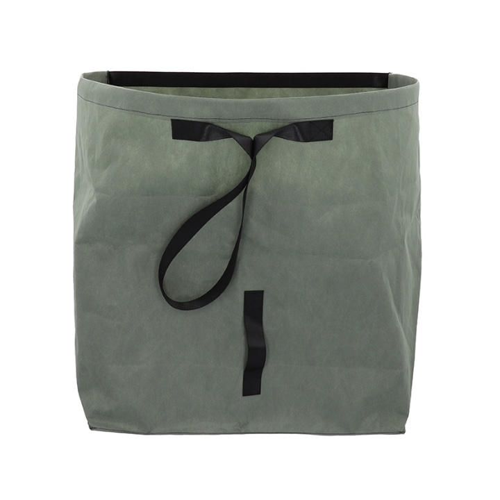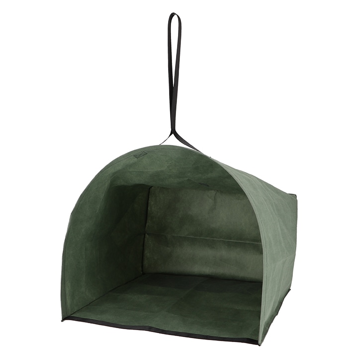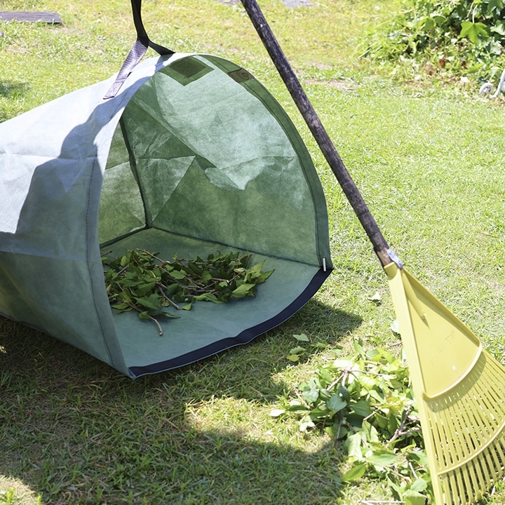 素材は、環境にもやさしいリサイクルポリエステル製。薄くたたんで保管できるので、使わない時も場所を取りません。使用時はワイヤーを通して口を固定。ぱっと開いて、すぐ使える手軽さも嬉しいポイントです。 カラーは、土や植物に自然になじむモスグリーン。庭の景観を損ねず、すっきり使えます。