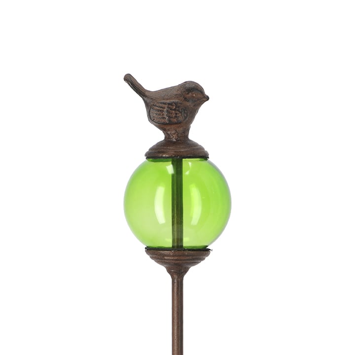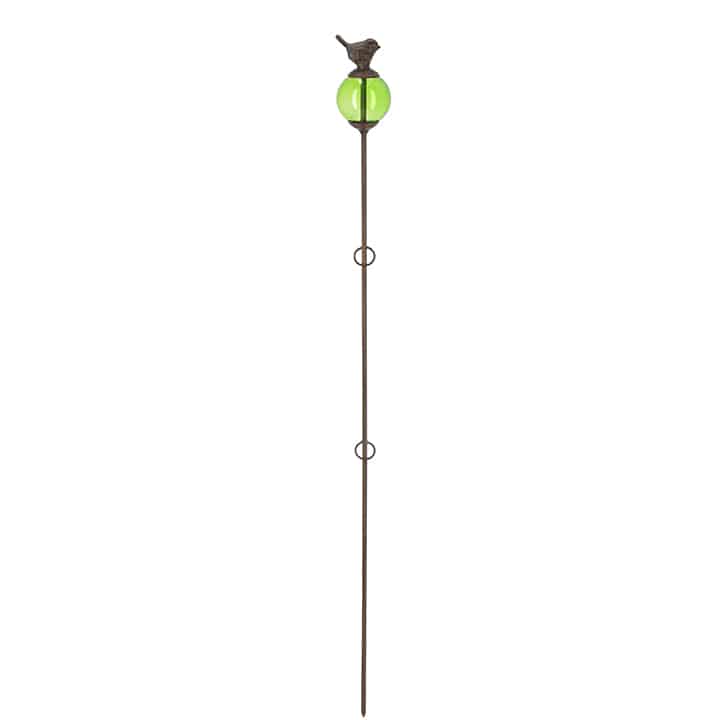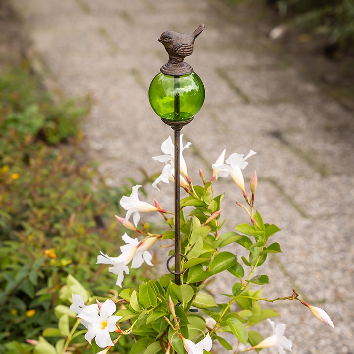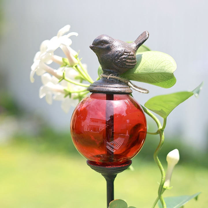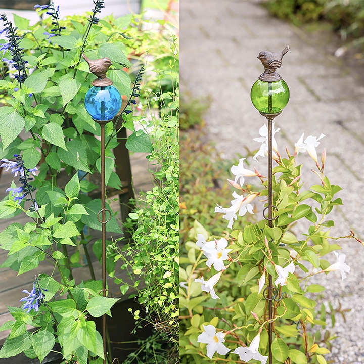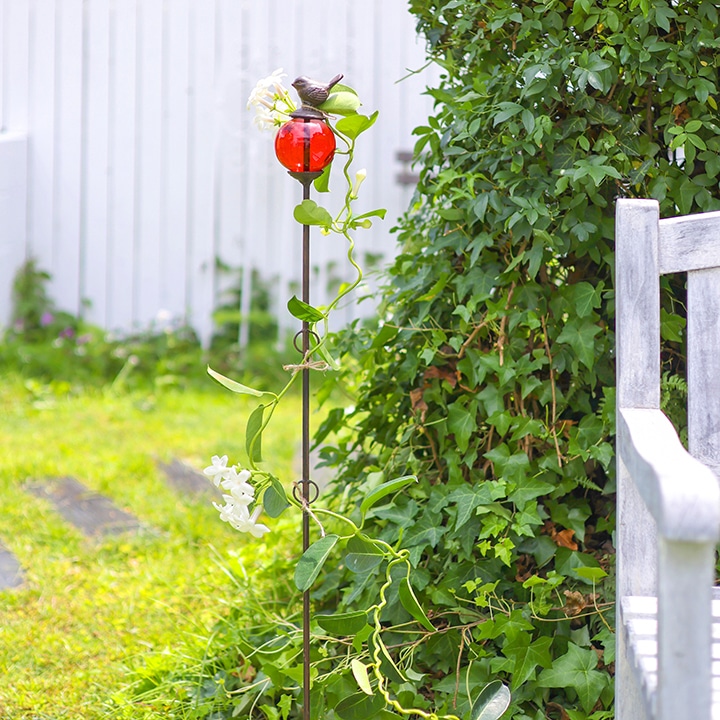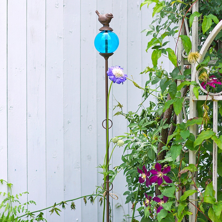 支柱の頂部には、透明感のあるガラス玉。その上に小鳥がちょこんととまったような愛らしいデザインです。ガラスはグリーン、ブルー、レッドの3色展開。花色や庭の雰囲気に合わせてコーディネートすれば、より一層エレガントな景色を演出できます。