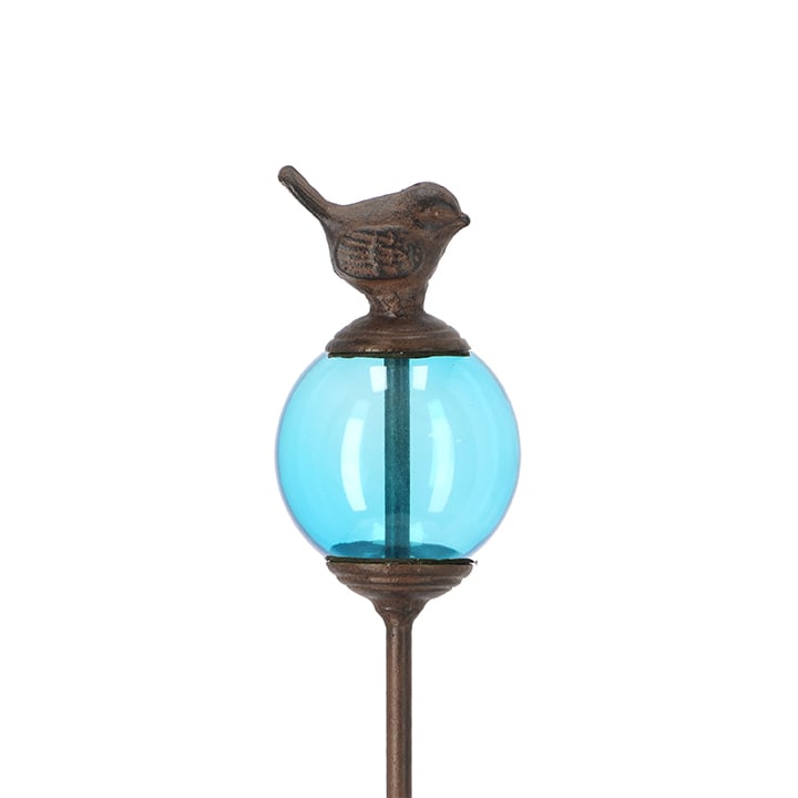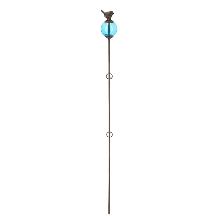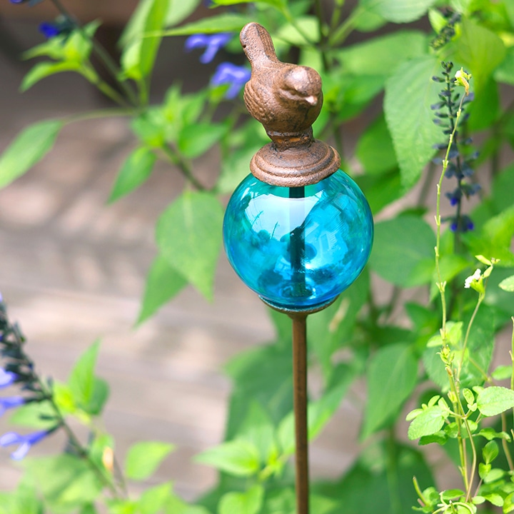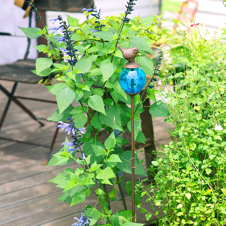 支柱の頂部には、透明感のあるガラス玉。その上に小鳥がちょこんととまったような愛らしいデザインです。ガラスはグリーン、ブルー、レッドの3色展開。花色や庭の雰囲気に合わせてコーディネートすれば、より一層エレガントな景色を演出できます。