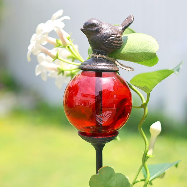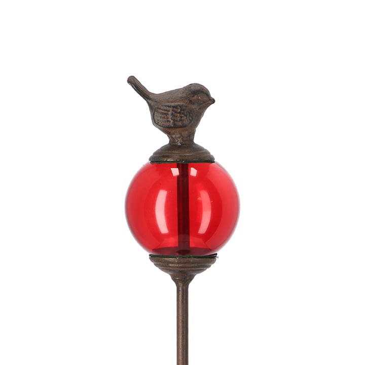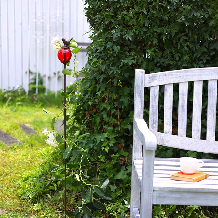 支柱の頂部には、透明感のあるガラス玉。その上に小鳥がちょこんととまったような愛らしいデザインです。ガラスはグリーン、ブルー、レッドの3色展開。花色や庭の雰囲気に合わせてコーディネートすれば、より一層エレガントな景色を演出できます。
