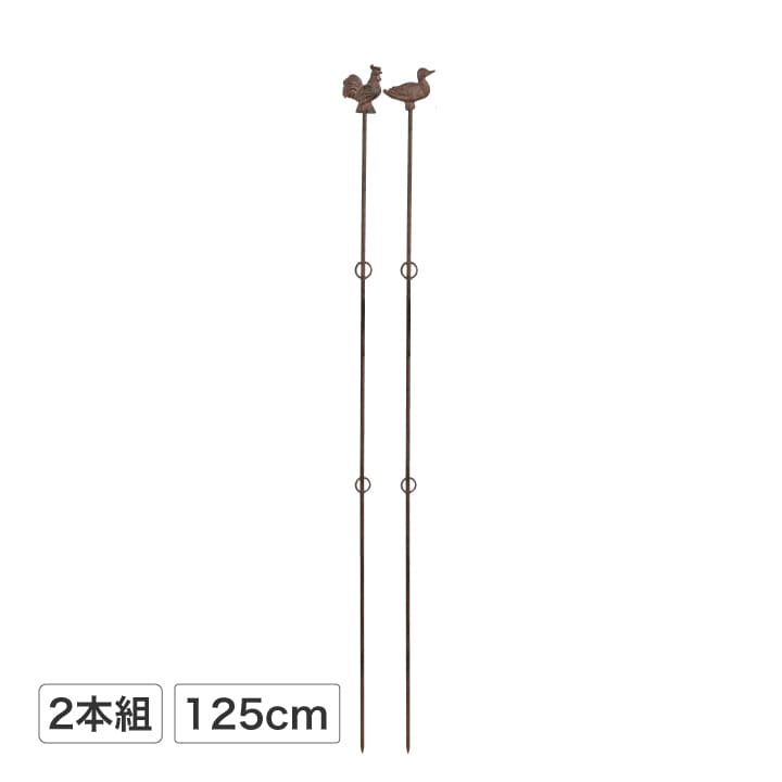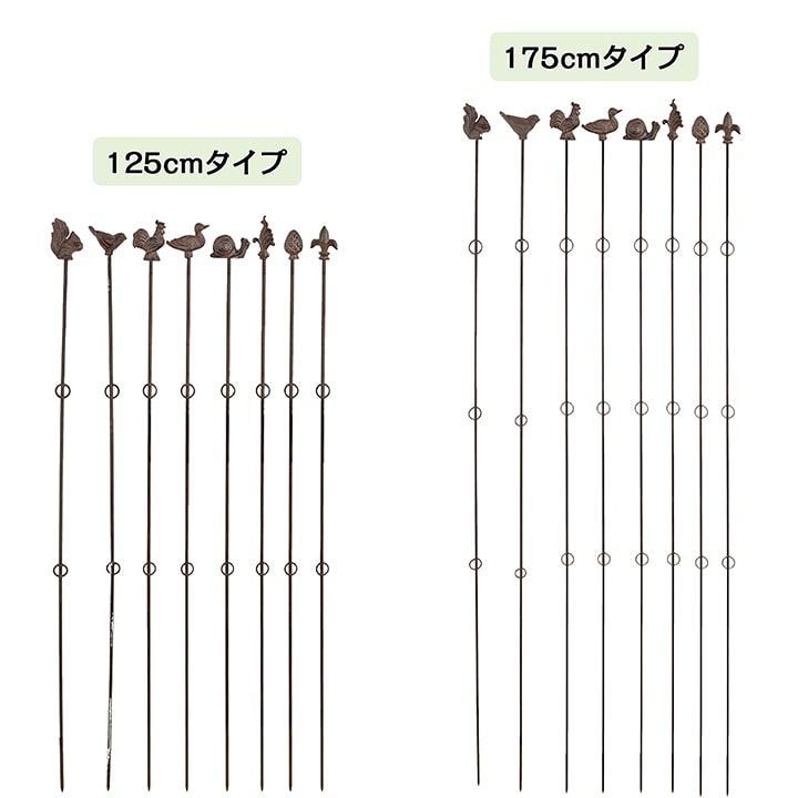 上部には8種類の装飾モチーフ(2本セットで4パターンから選択可)。アンティークカラーの鋳鉄製で、植物が絡みつく季節以外にも庭の景色を豊かに演出します。「ただの支柱」ではなく、植物と共に庭を引き立てるガーデンオブジェとしての魅力も兼ね備えています。