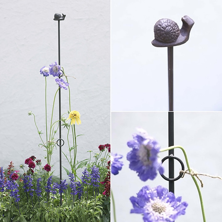 草丈が高い植物の倒れを防止したり、つる植物を誘引するのに重宝します。リングに誘引ひもを結びつけて固定します。トップの飾りも庭のおしゃれなアクセントに。