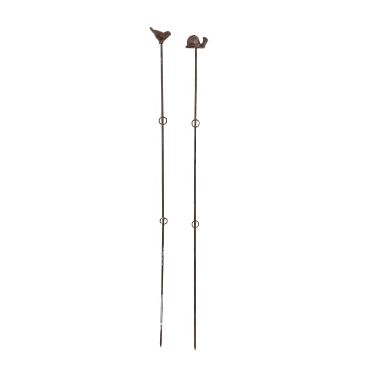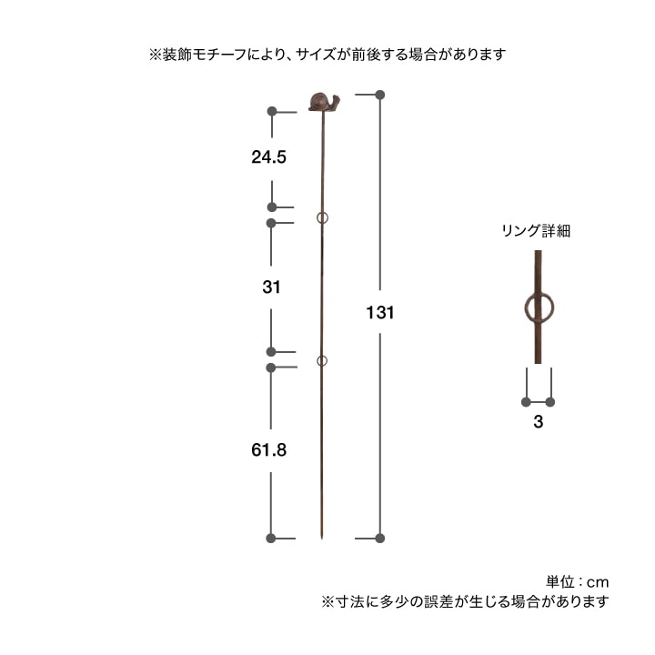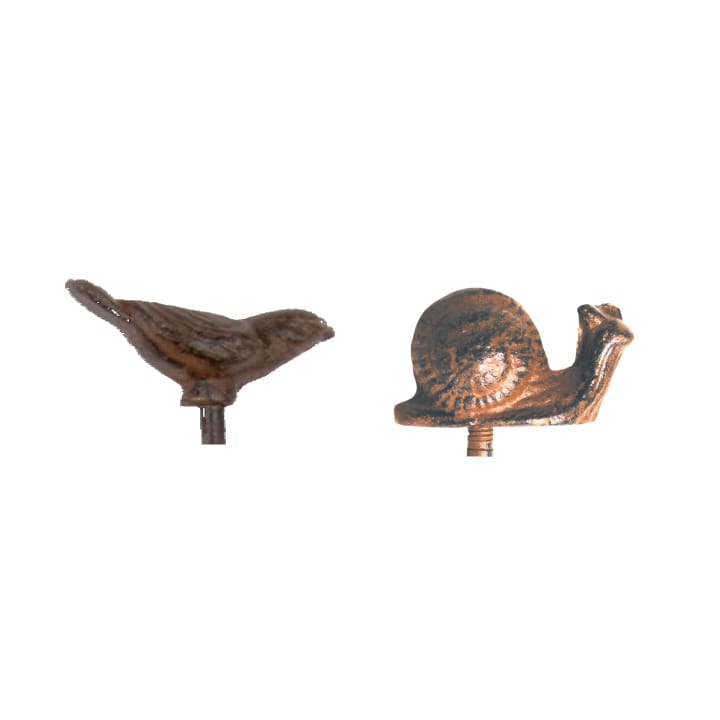 上部には8種類の装飾モチーフ(2本セットで4パターンから選択可)。アンティークカラーの鋳鉄製で、植物が絡みつく季節以外にも庭の景色を豊かに演出します。「ただの支柱」ではなく、植物と共に庭を引き立てるガーデンオブジェとしての魅力も兼ね備えています。