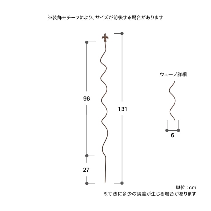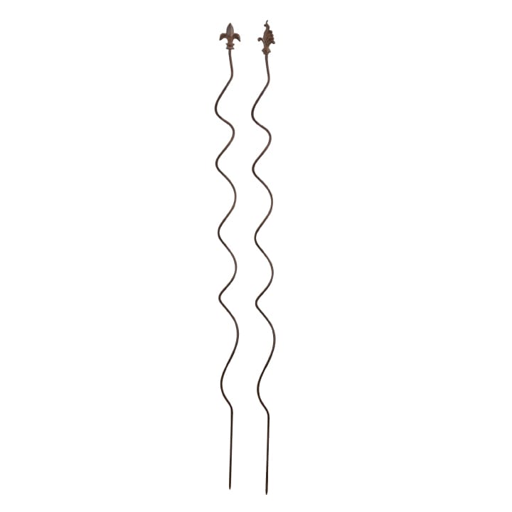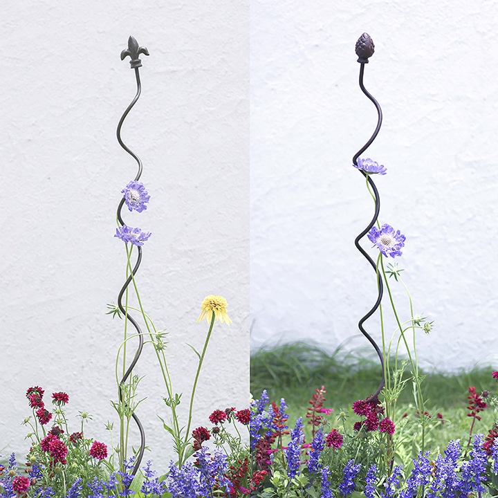 草丈が高い植物の倒れを防止したり、つる植物を誘引するのに重宝します。ゆるやかなウェーブラインはエレガントな雰囲気を醸し出すだけでなく、誘引ひもがずり下がるのを防ぐ機能も兼ね備えます。トップの飾りも庭のおしゃれなアクセントに。