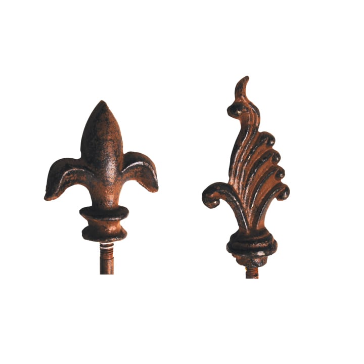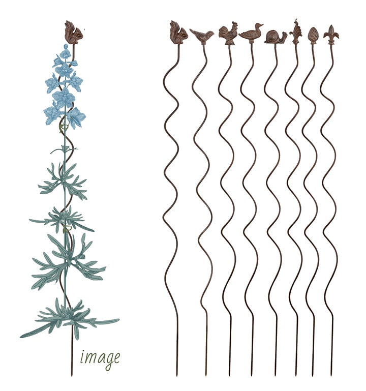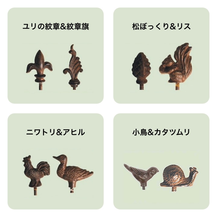 緩やかなウェーブラインは、ただの装飾ではありません。植物を沿わせるだけで支柱として機能し、ひもを結んだ時にもずり落ちにくい形状になっているため、つる植物の誘引や背の高い花の固定も安定感抜群。 本セットのトップの装飾モチーフは8種類あり、こちらの4つの組み合わせの中からお選びいただきます。