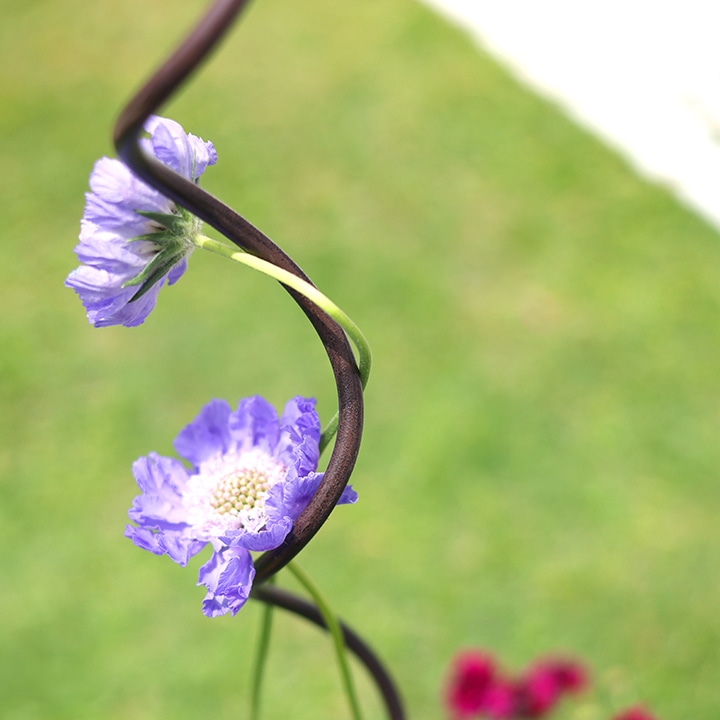 草丈が高い植物は、風や雨で倒れやすく、美しい姿を保つのが難しいもの。そんな時に活躍するのが、この「飾り付きプランツサポート ウェーブ」です。ゆるやかな曲線を描く支柱は、エレガントな雰囲気を醸し出しながら、しっかりと草花を支えてくれる頼もしい存在。 特に、デルフィニウムやスカビオサ、リナリア、スイートピー、クレマチスなど、茎が細く繊細で倒れやすい植物に最適です。株元に挿して、ウェーブ部分に沿って茎を絡ませたり、麻ひもなどでやさしく結びつければ、自然な姿のまま花を支えることができます。支柱感が強すぎず、よりナチュラルな雰囲気を演出できます。