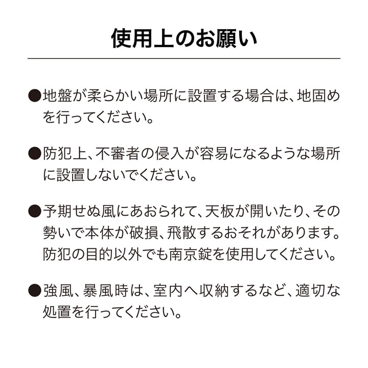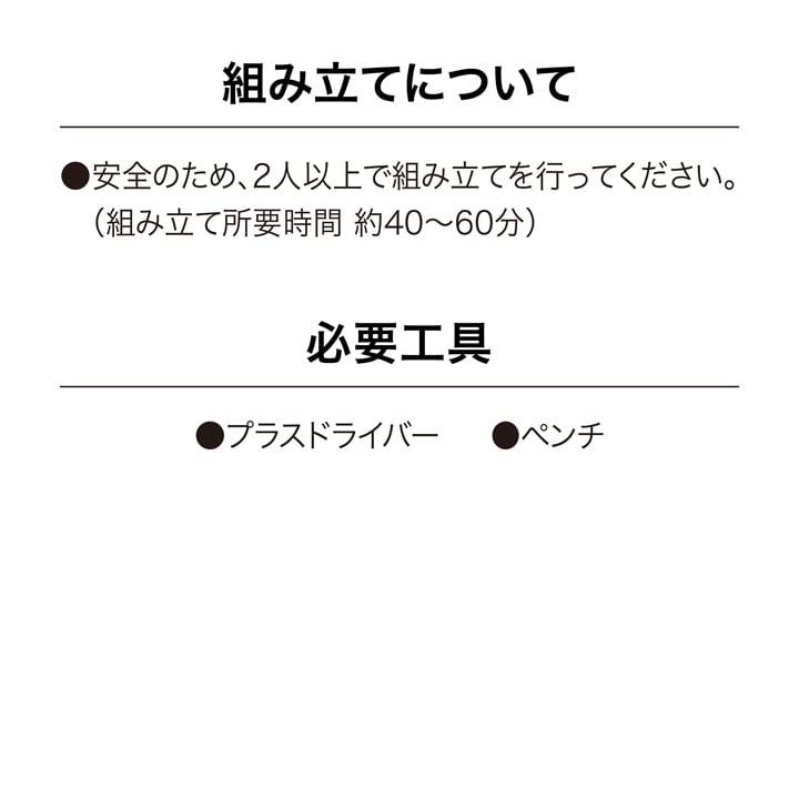 | 備考 : | [底板の耐荷重]100kgまで[天板の耐荷重]100kgまで(2人用) [組立必要人数]2人以上 [本体組立時間]40〜60分 [付属工具]六角レンチ(開閉強度調整用) [お客様手配必要工具]プラスドライバー、ペンチ |