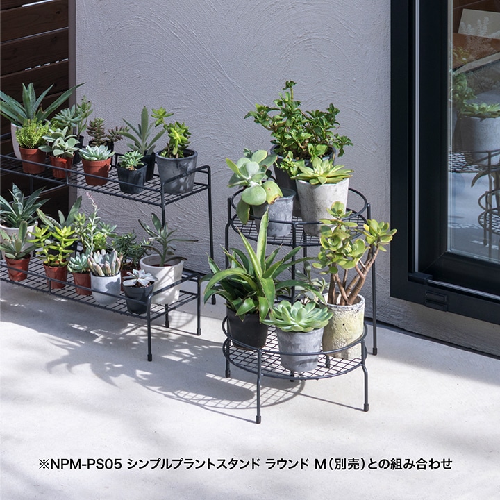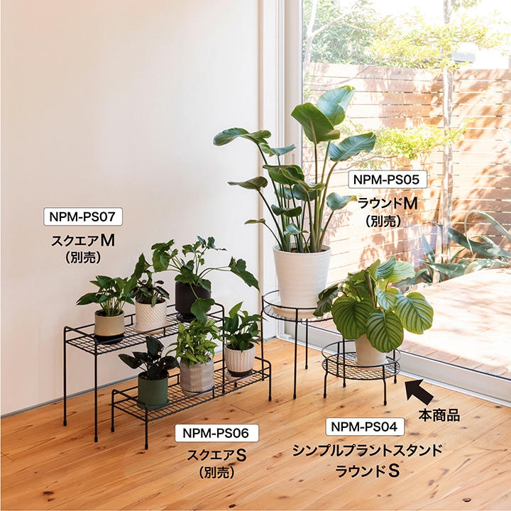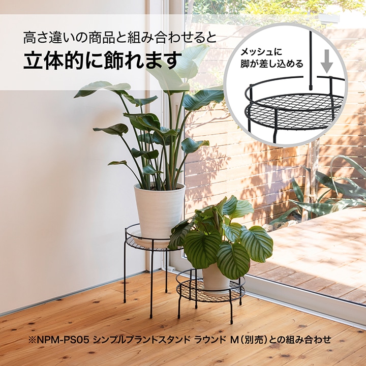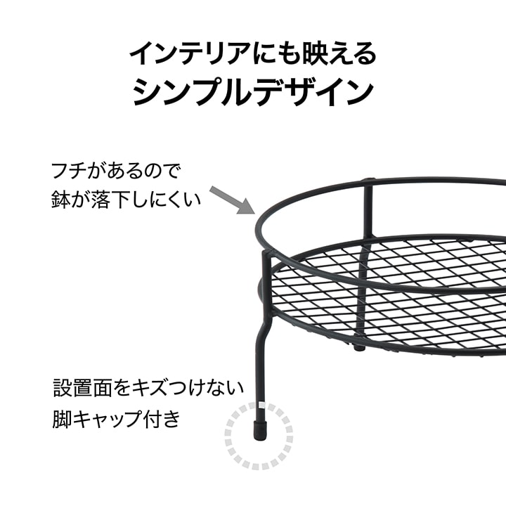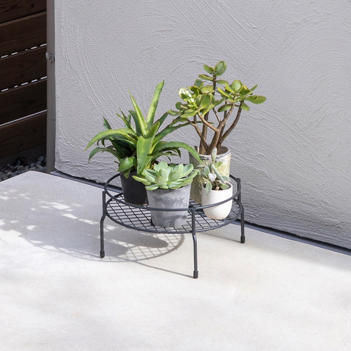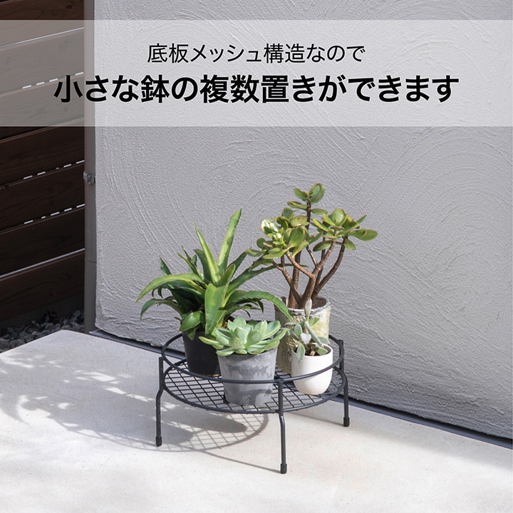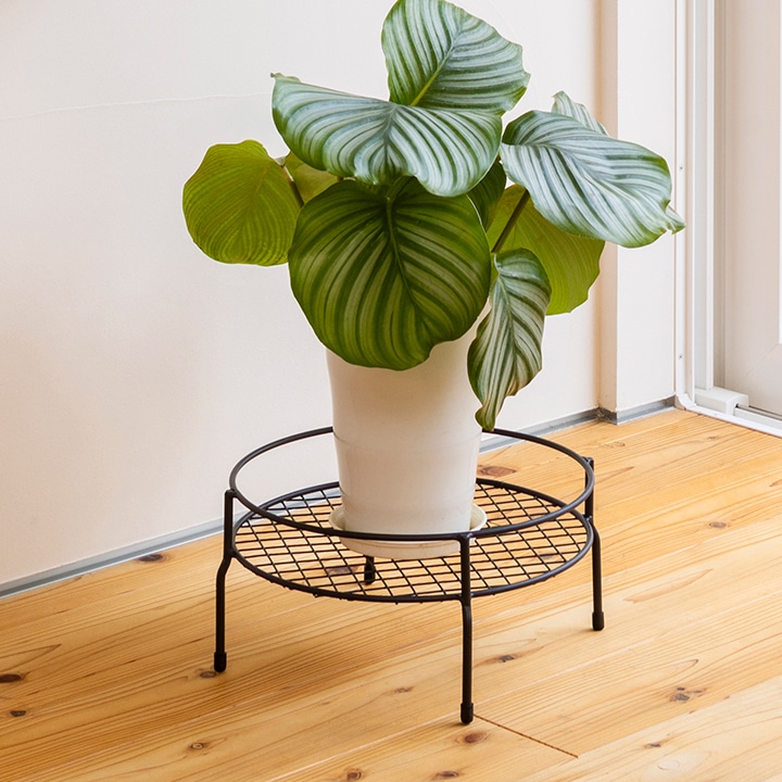 インテリアにも映えるプラントスタンド。フチがあるので鉢が落ちにくく、小さな鉢も置けるメッシュ構造。