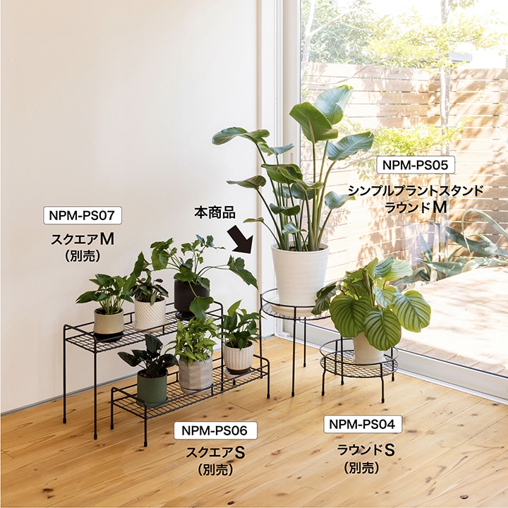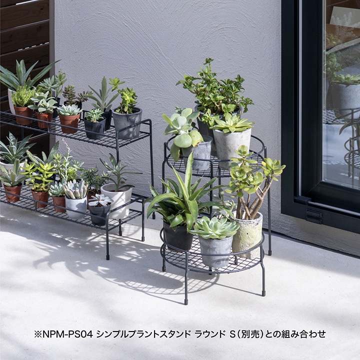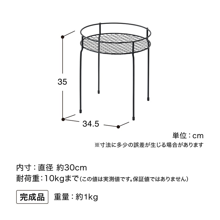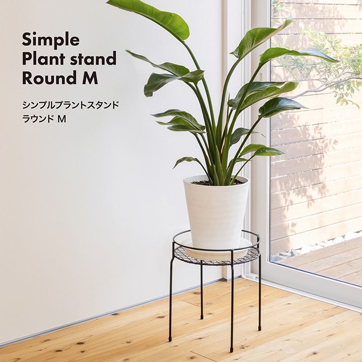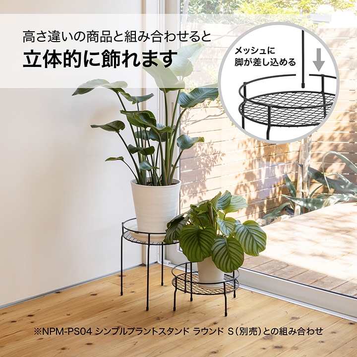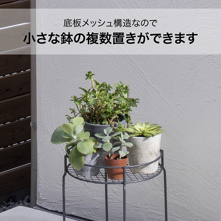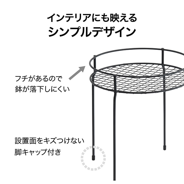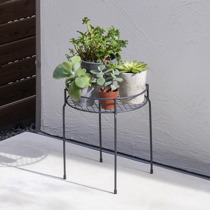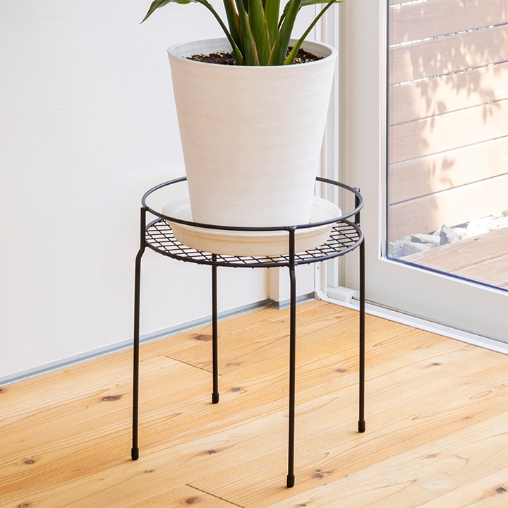 インテリアにも映えるプラントスタンド。フチがあるので鉢が落ちにくく、小さな鉢も置けるメッシュ構造。